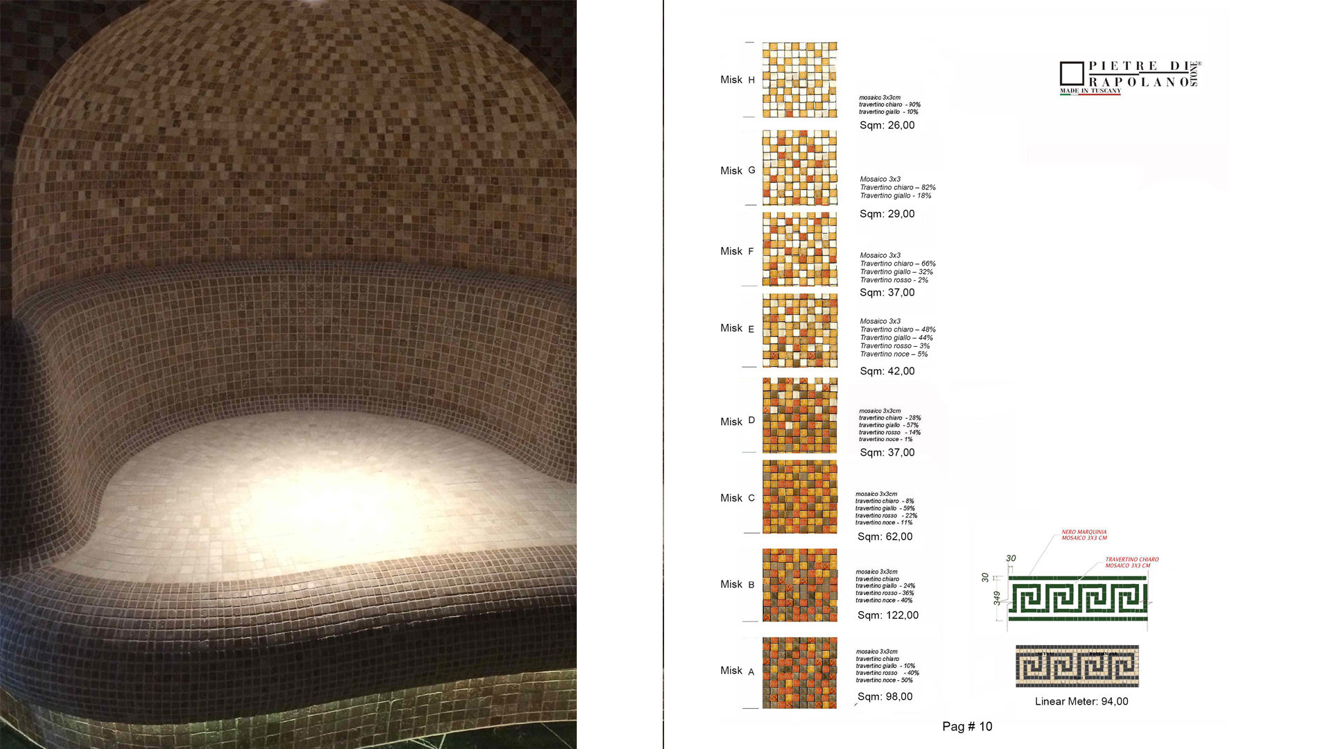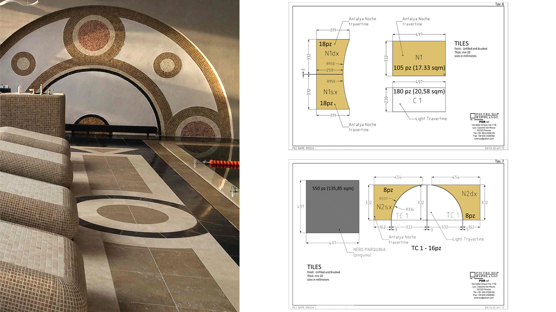 Работа, выполненная по смешиванию различных цветов мозаики для внутренней части бассейна, также была интересной: дизайнеры хотели, чтобы глубина вода увеличилась, цвет мозаики стал темнее. Поэтому, выбрав 4 тона травертина , их процентное содержание варьировалось в зависимости от глубины.