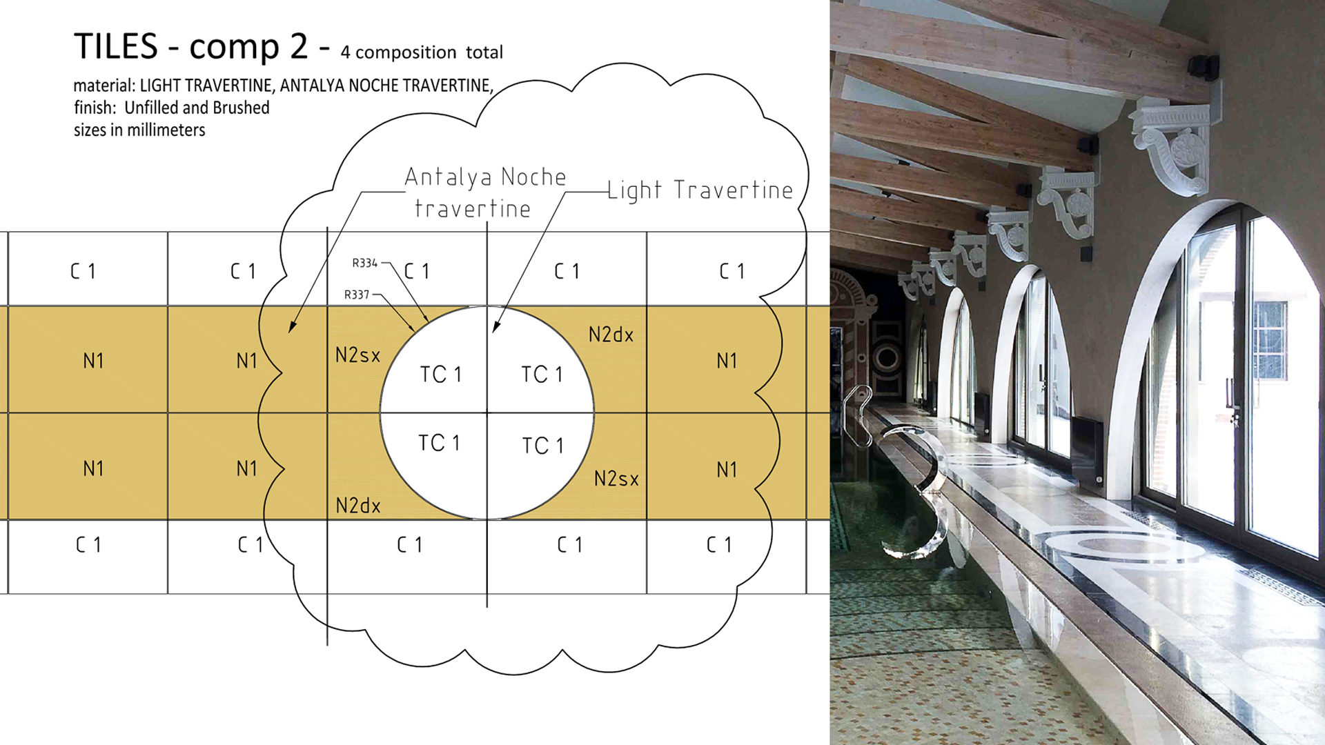 В качестве материалов для полов, стен, мозаичного декора и специальных элементов был выбран травертин Бекагли Кьяро Nero Marquinia и мозаики разных цветов и узоров. В частности, желтый и красный травертин иранского происхождения также использовался в мозаичной облицовке внутри бассейна.