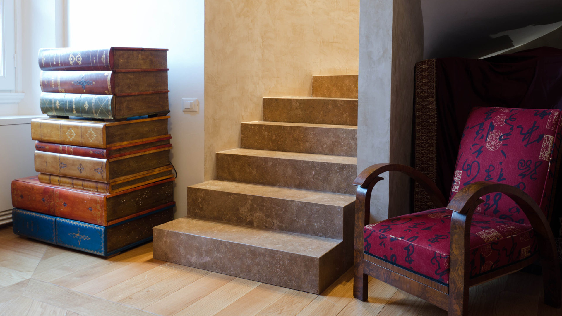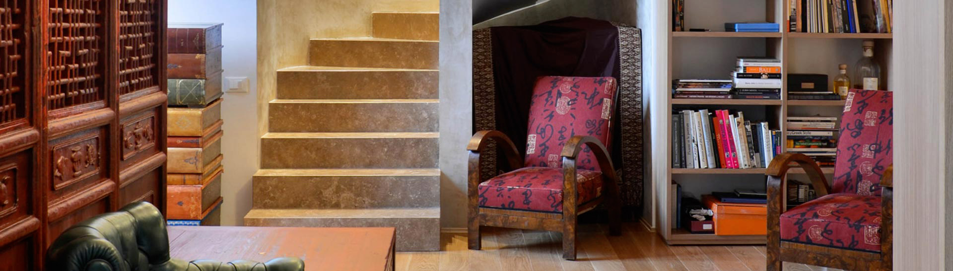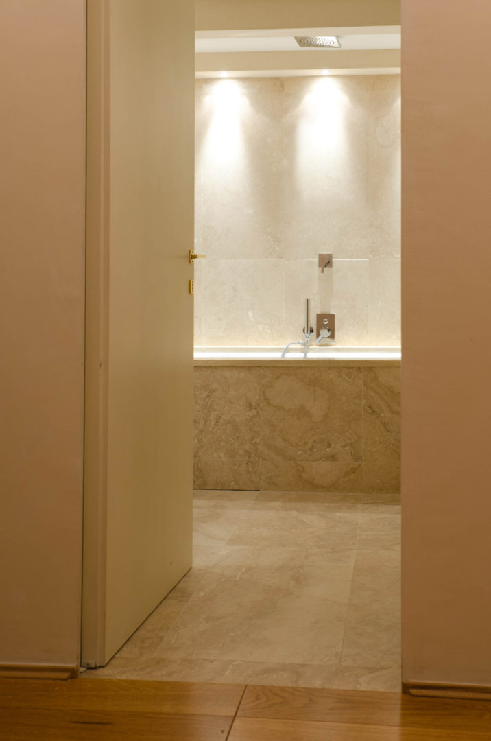 В резиденции, которая занимает два этажа , наши травертины использовались для ванных комнат , кухня и внутренняя лестница . Выбранные цвета варьируются от светлого травертина до темного травертина до прожилок, в зависимости от окружающей среды и желаемых хроматических эффектов.