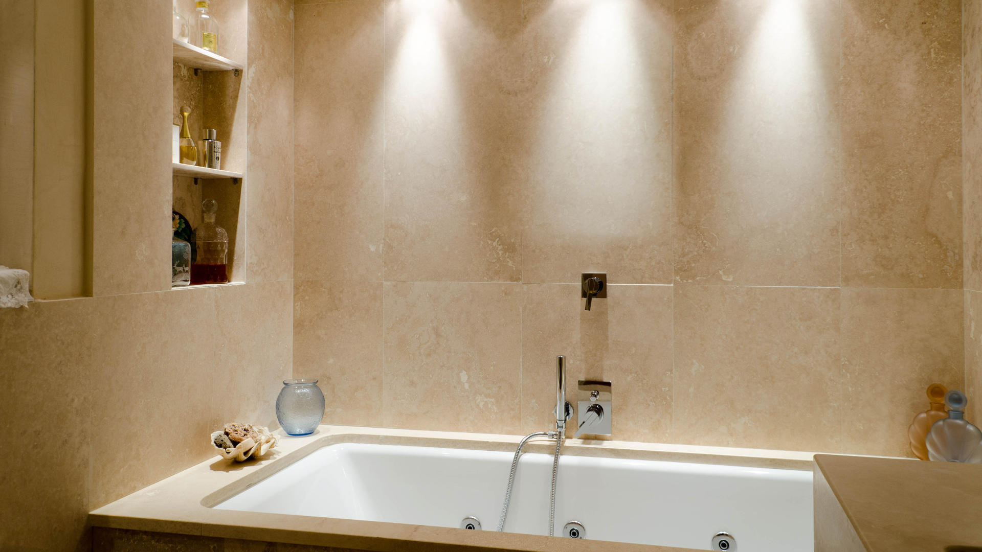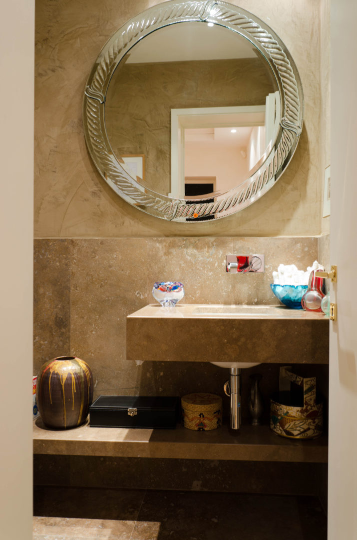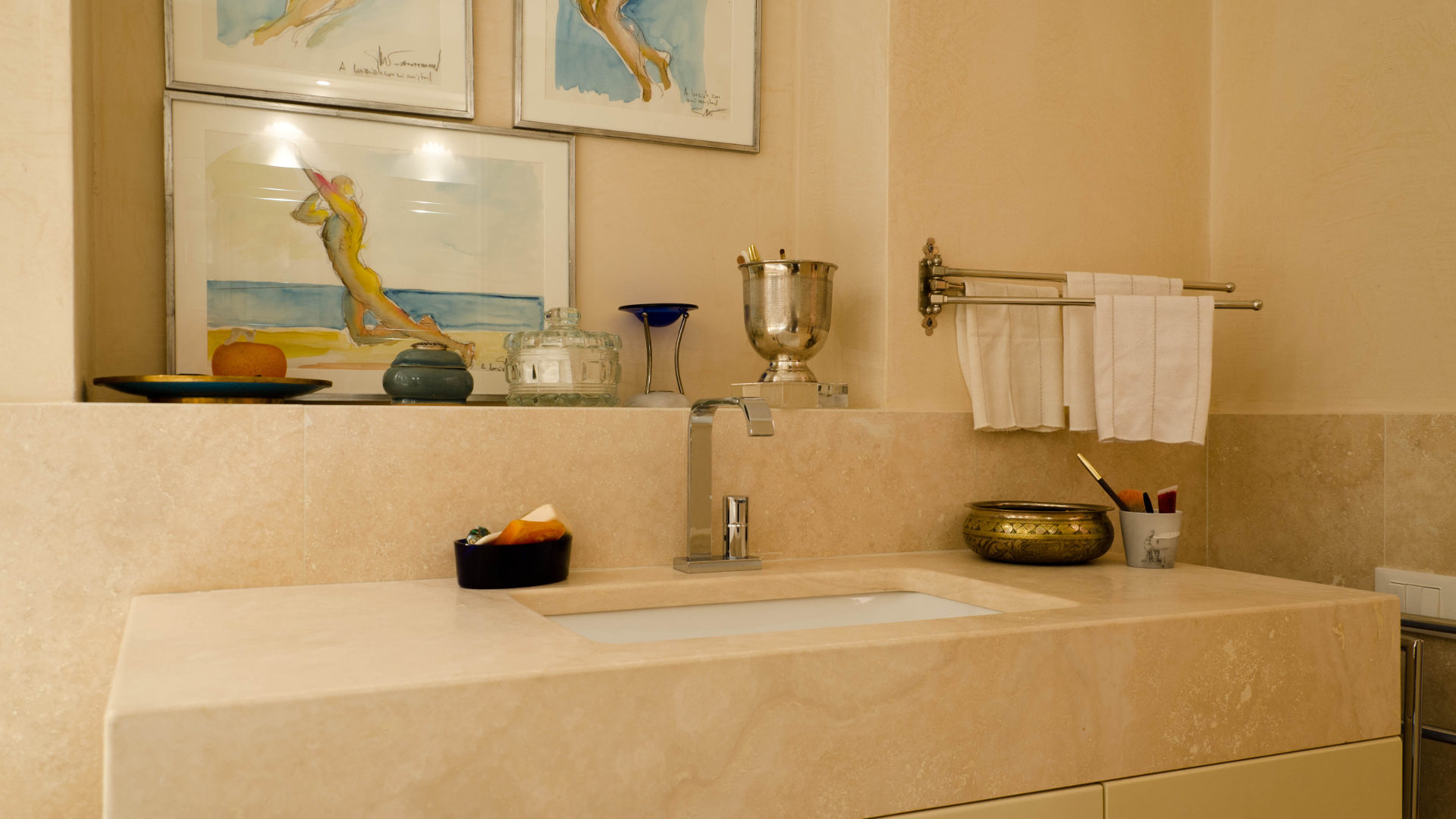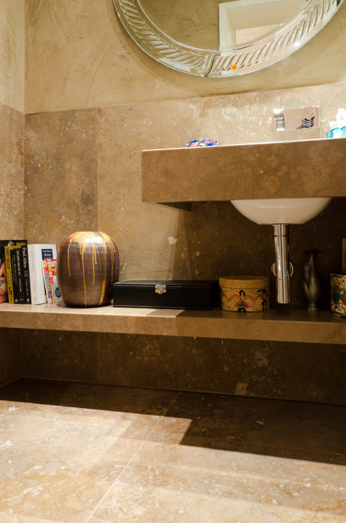 Кроме того, служебная ванная комната также была облицована травертином Becagli Scuro для полов, покрытий и верхней части умывальника.