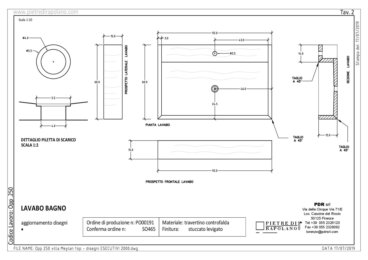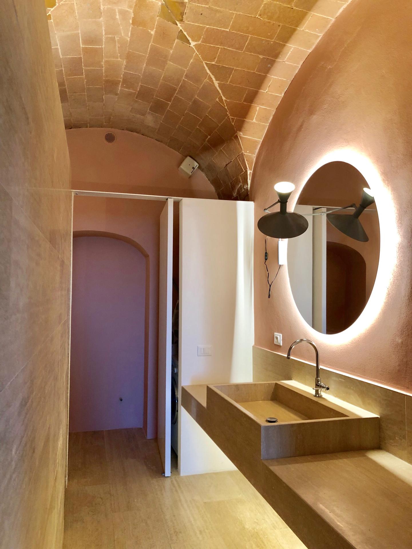Столешница, предназначенная для умывальника на заказ, а также из травертина, утоплена в стену и выполнена в виде единой столешницы с большой собранной и встроенной раковиной. Владельцам требовалось большое пространство, которым могли бы пользоваться одновременно несколько членов семьи. Стены частично выкрашены в розовые тона с использованием моющейся краски, которая хорошо гармонирует с бежевыми тонами травертина, отражая его цвета.