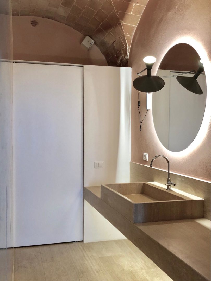 Для освещения этой среды использовались линейные светодиодные фонари, спрятанные под верхом или в специально разработанных нишах. Зеркало оснащено системой подсветки и окружено точечным светом с регулируемым кронштейном с двумя шарнирами (это Lampe de Marseille , знаменитый светильник-рационалист, разработанный Ле Корбюзье для марсельской квартиры в 1949/52 году, переизданный Nemolighting ).
