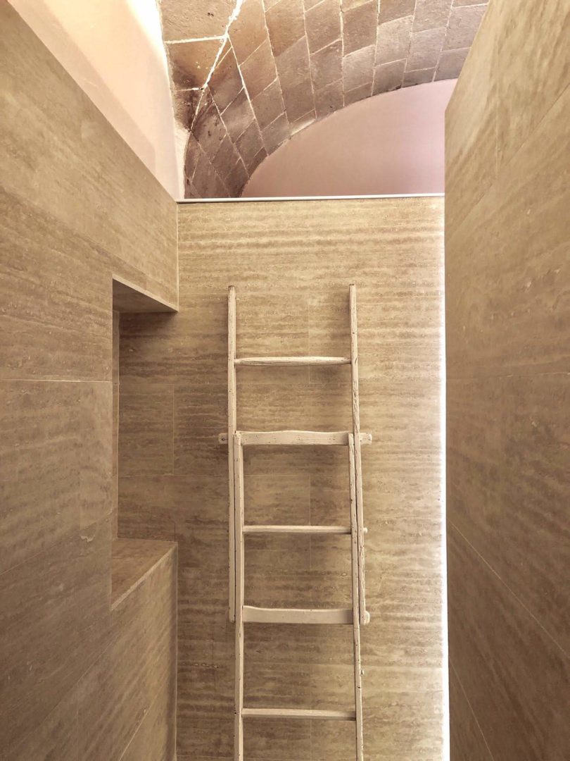 Пространство, прилегающее к кухне, используемое как прихожая и душ, также полностью облицовано травертином того же типа PDR040 ZEBRA CHIARA . Вертикальные настенные плитки были установлены с швами в несколько миллиметров и образуют крылья с прожилками, которые повторяются и переходят друг в друга, создавая непрерывное и однородное изображение для всей площади, зернистость заметна и довольно прямолинейна, а окончательный вид что единой материальной среды.