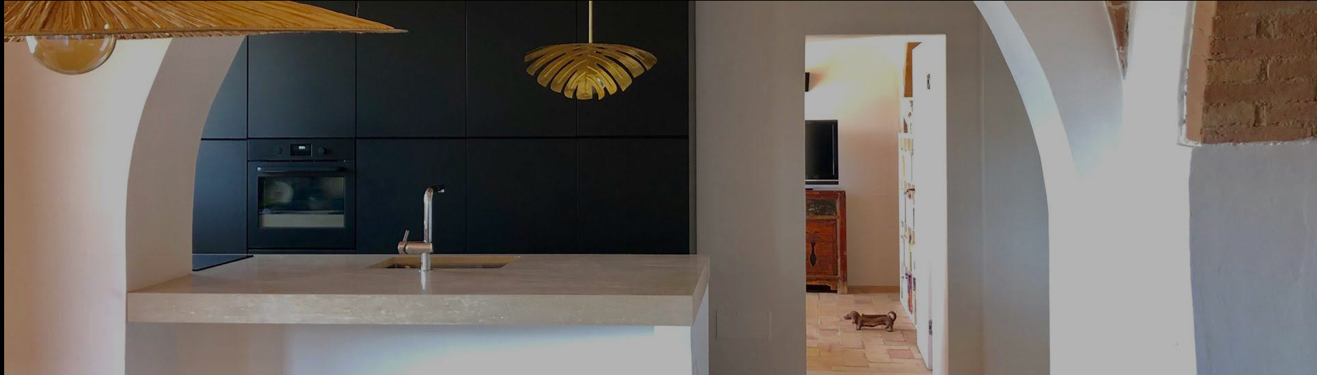 В центральной части кухни спроектирован большой оборудованный полуостров; это верхняя часть коробчатого типа из светлого травертина с вуалью 10 см, которая служит поверхностью для мытья и приготовления пищи, а также служит столешницей для завтрака.