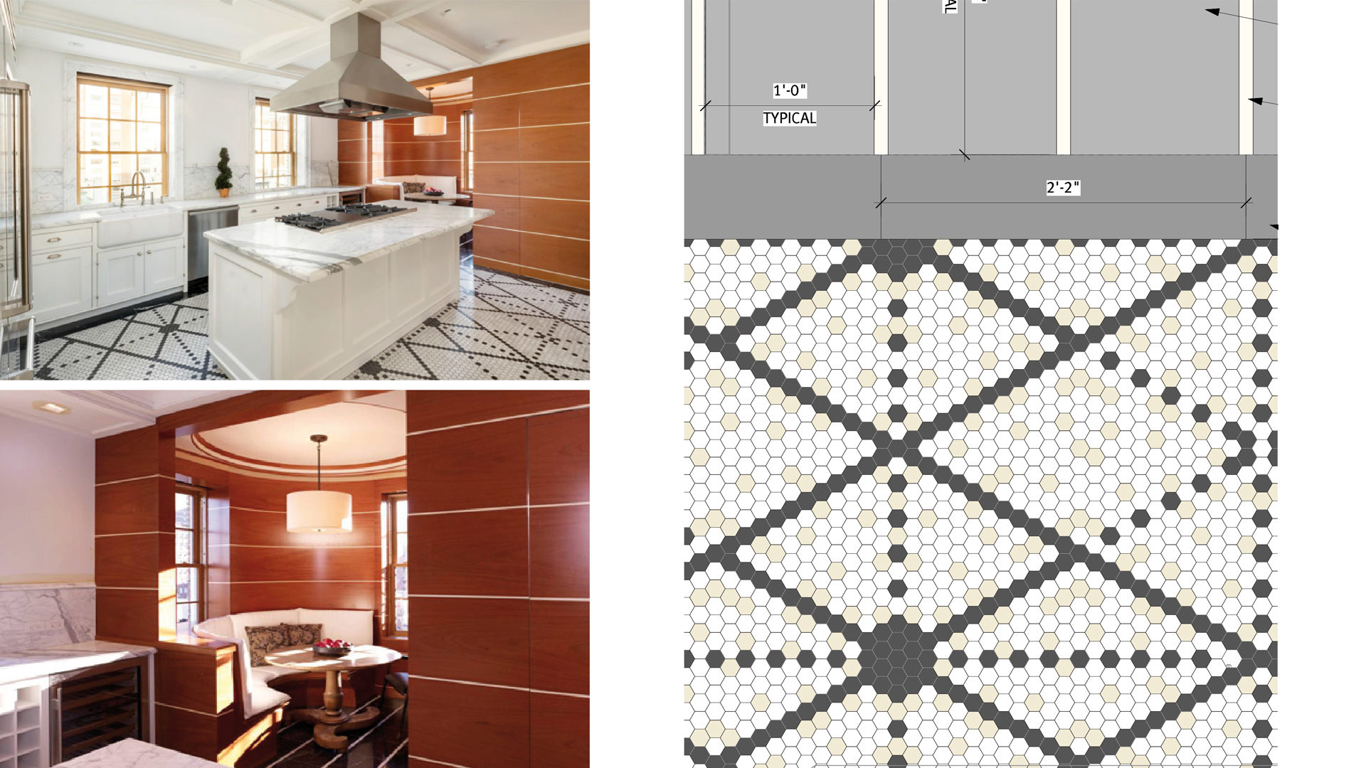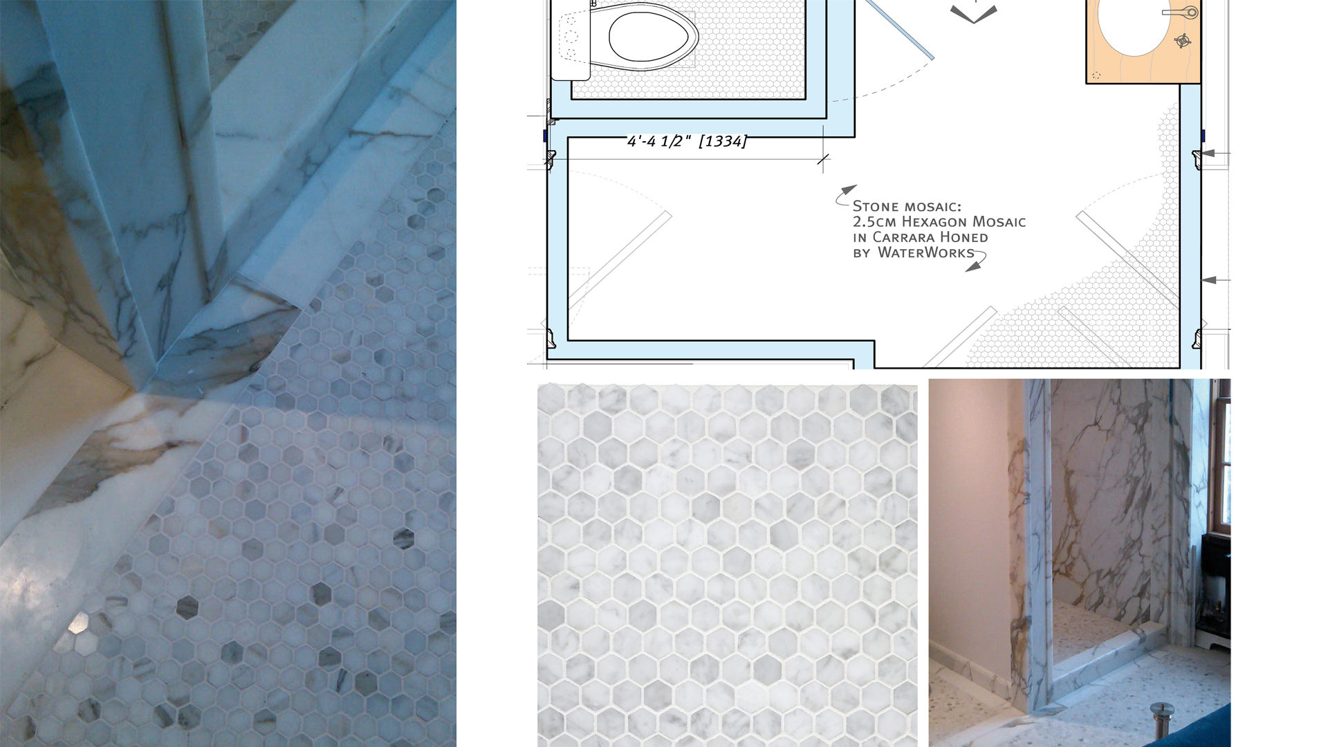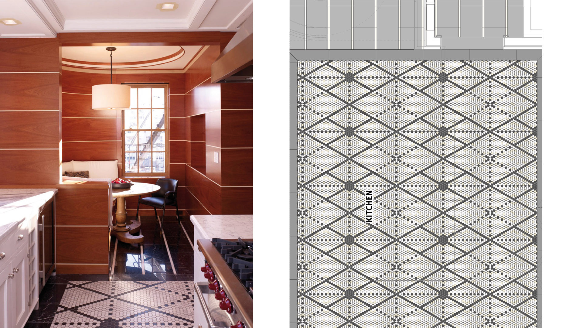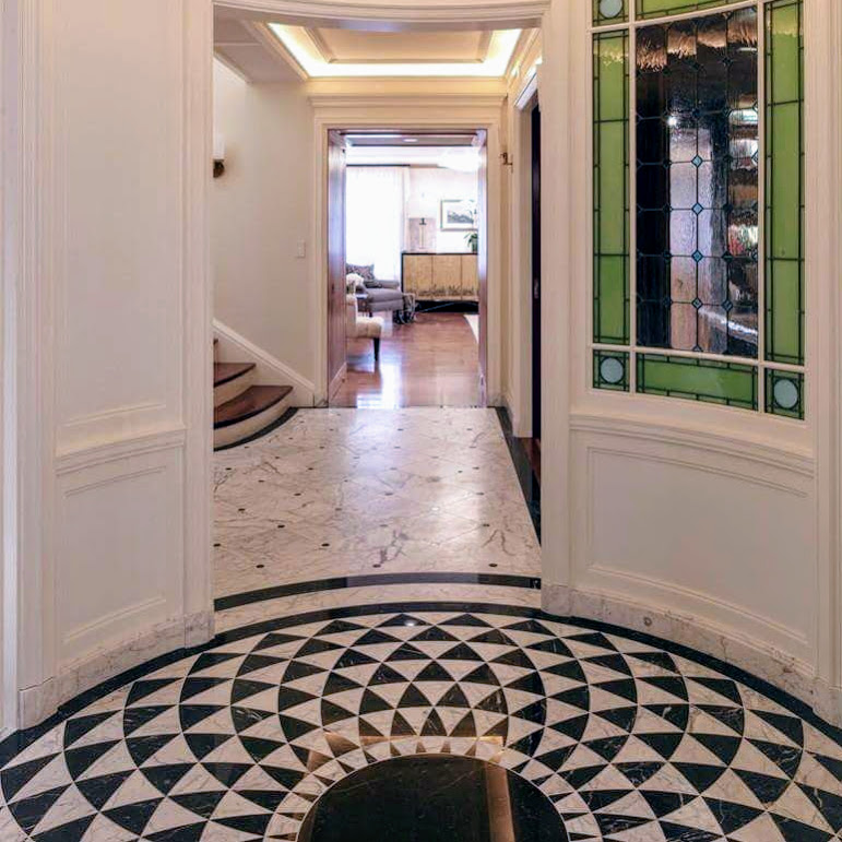 Компания Pietre di Rapolano предоставила плиты Calacatta , которые затем обрабатывались в Соединенных Штатах, а также поставила входную розетку окно , мозаика для кухни и ее опорные поверхности.