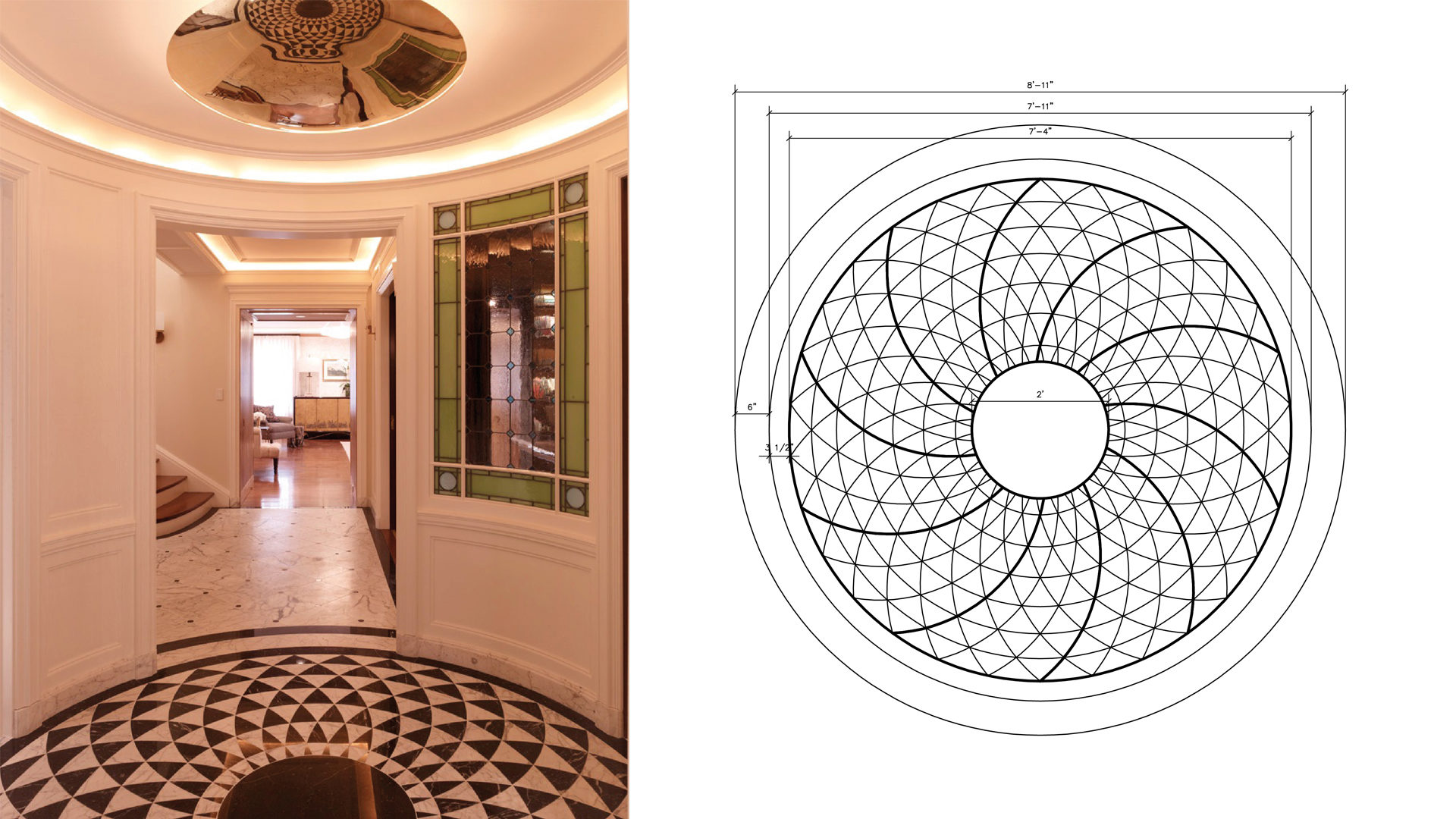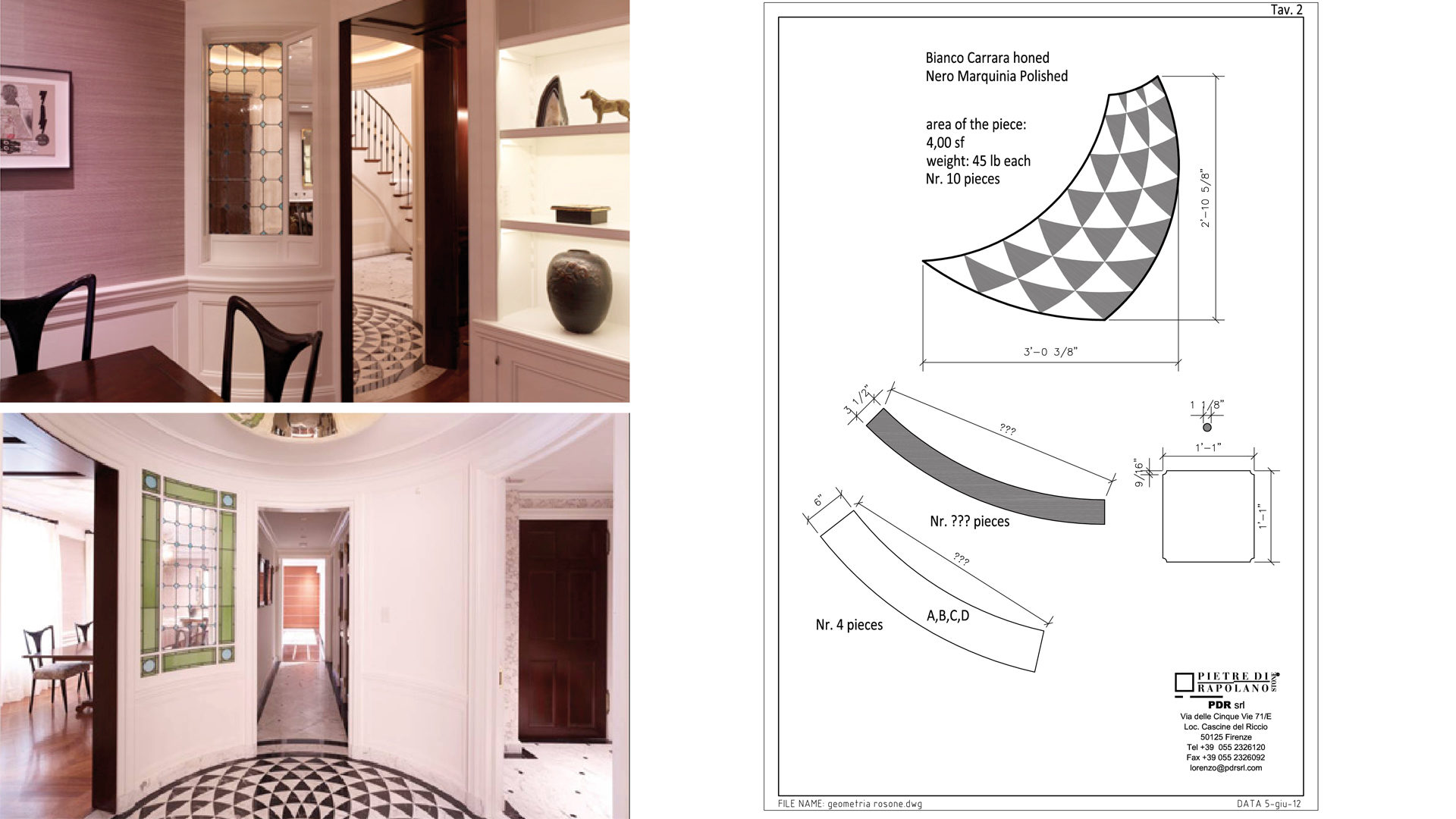 Изучая геометрию дизайна, мы смогли идентифицировать модуль, который при последовательном повторении легко воссоздавал весь дизайн (см. таблицы 0 и 2). Каждый модуль был предварительно собран в Италии , различные части были приклеены к фигурной мраморной плите: различные модули — всего 10 — впоследствии были легко установлены.