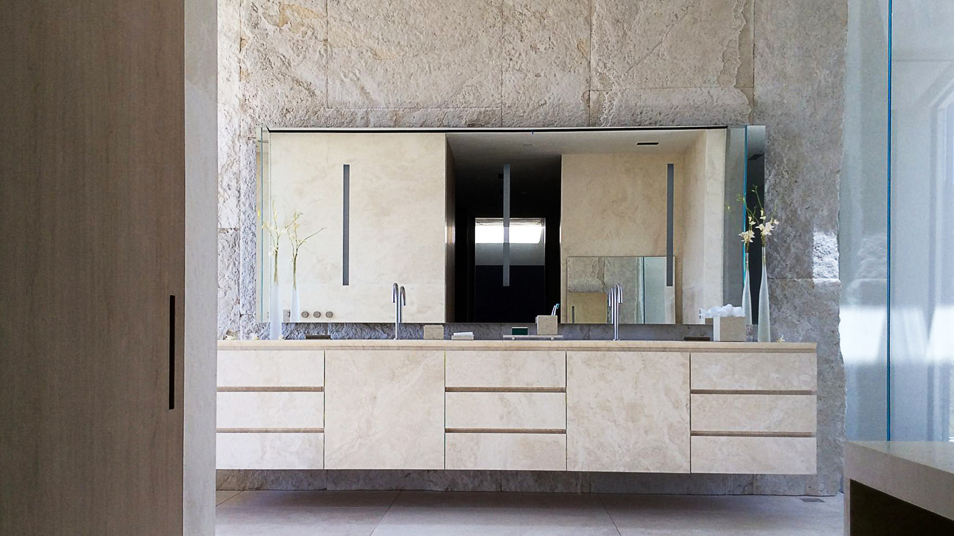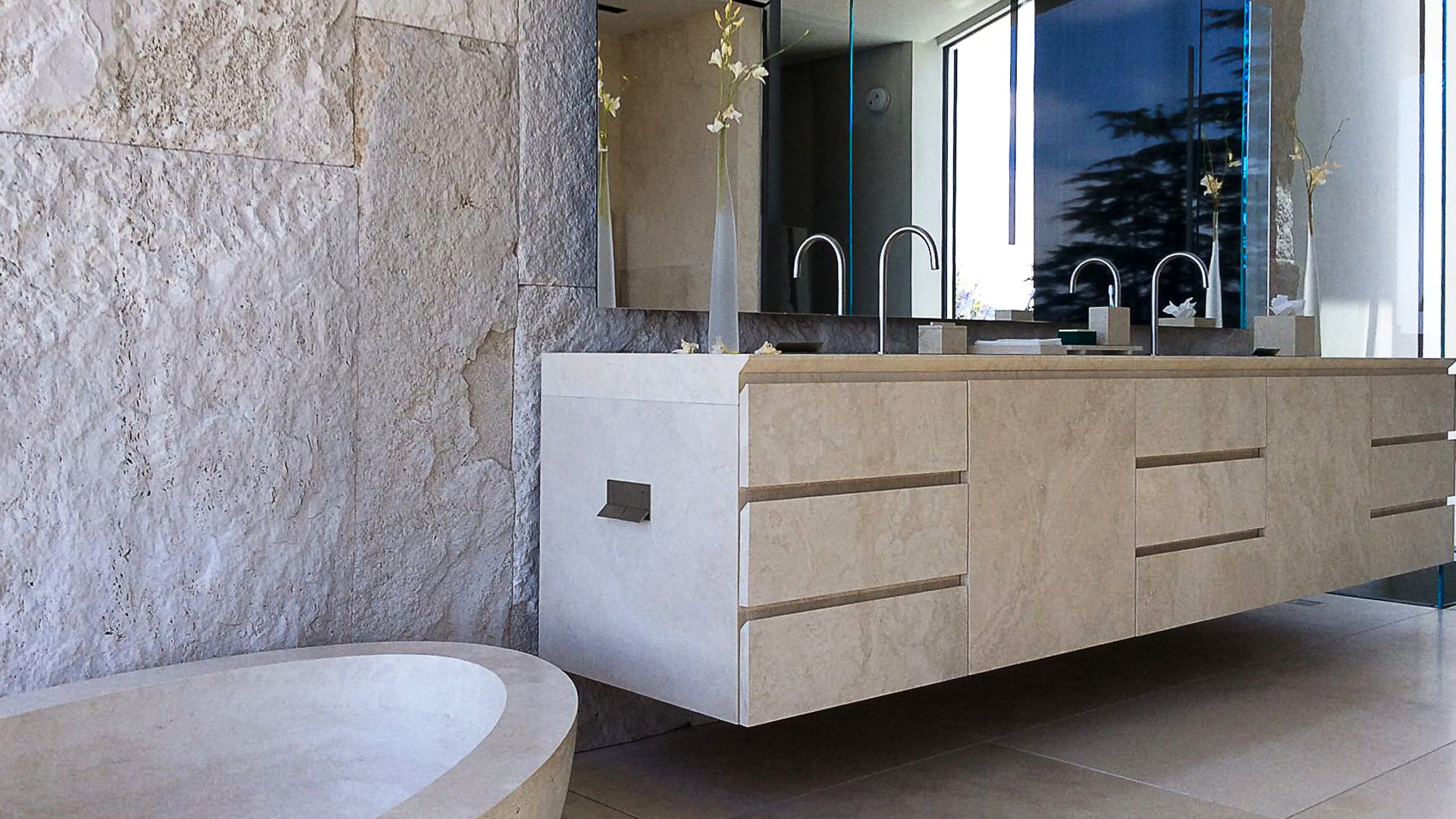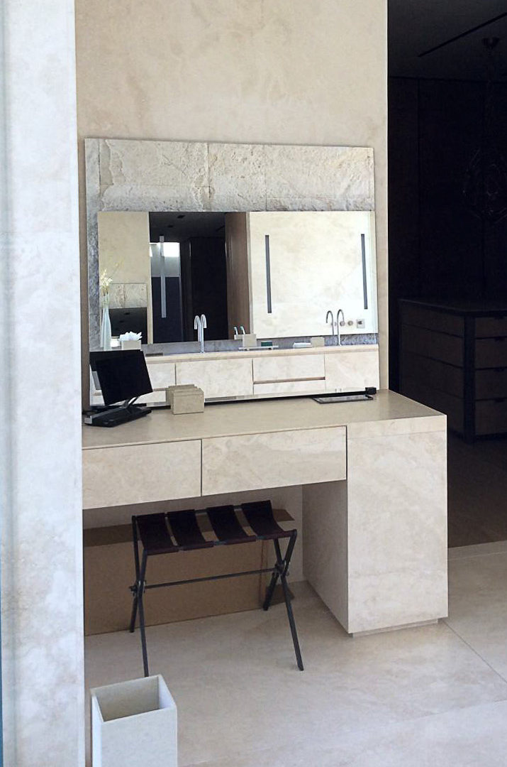 Главная ванная комната , помещенная в этой области, намеренно впечатляющая и роскошная, она полностью сделана из травертина Becagli Chiaro (код PDR006). Камень покрывает стены, пол, а также душ , ванну из цельного дерева и шкафчик для ванной .