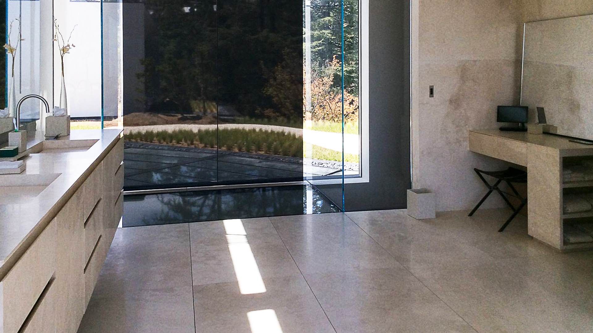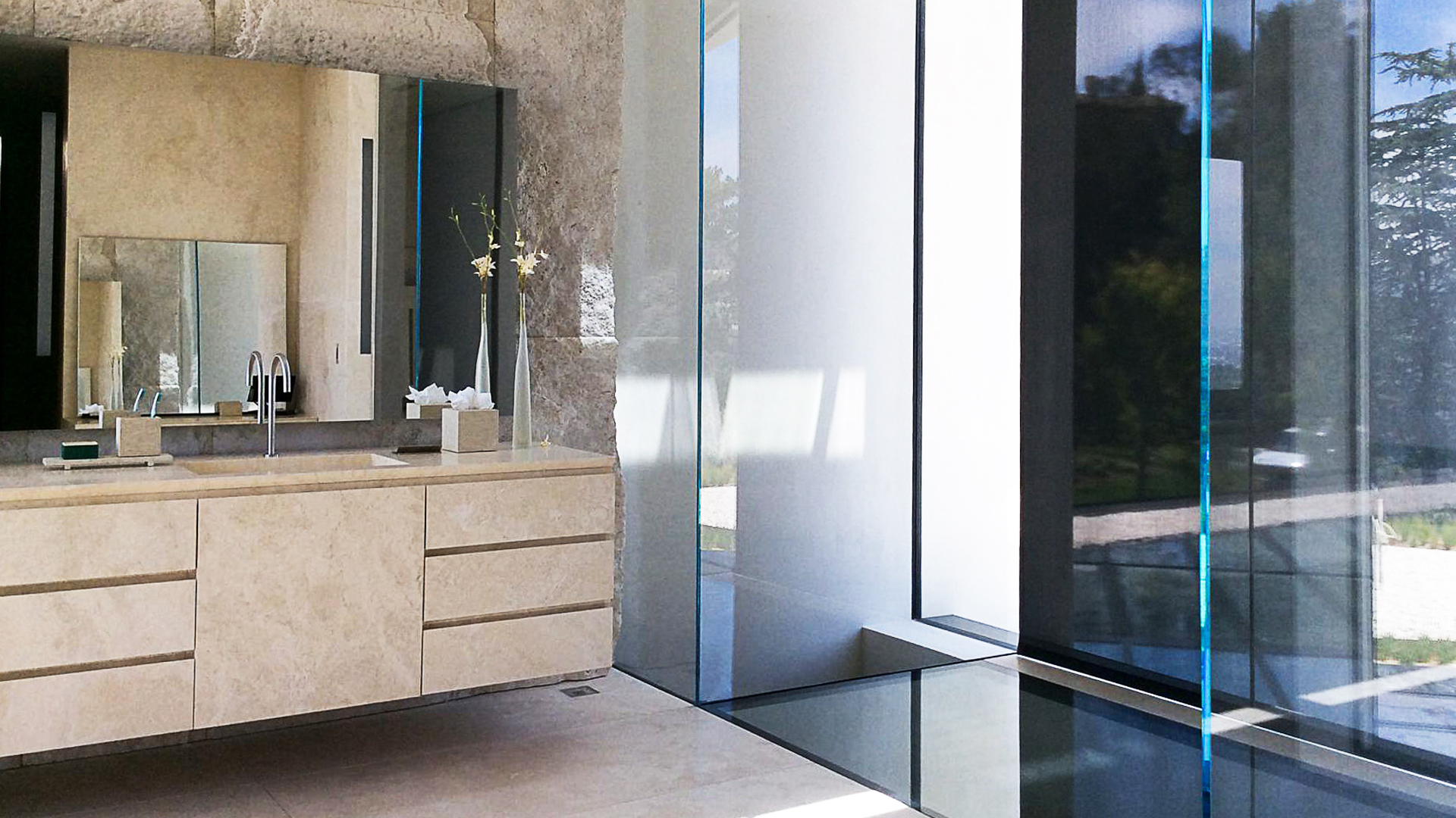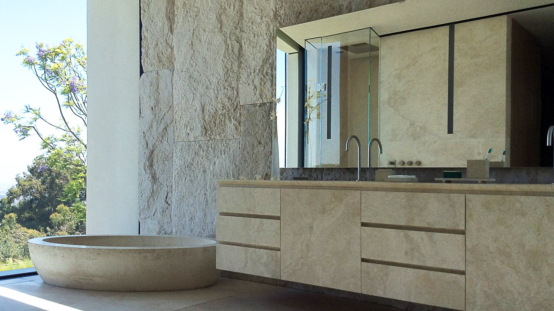 Главная ванная комната , помещенная в этой области, намеренно впечатляющая и роскошная, она полностью сделана из травертина Becagli Chiaro (код PDR006). Камень покрывает стены, пол, а также душ , ванну из цельного дерева и шкафчик для ванной .