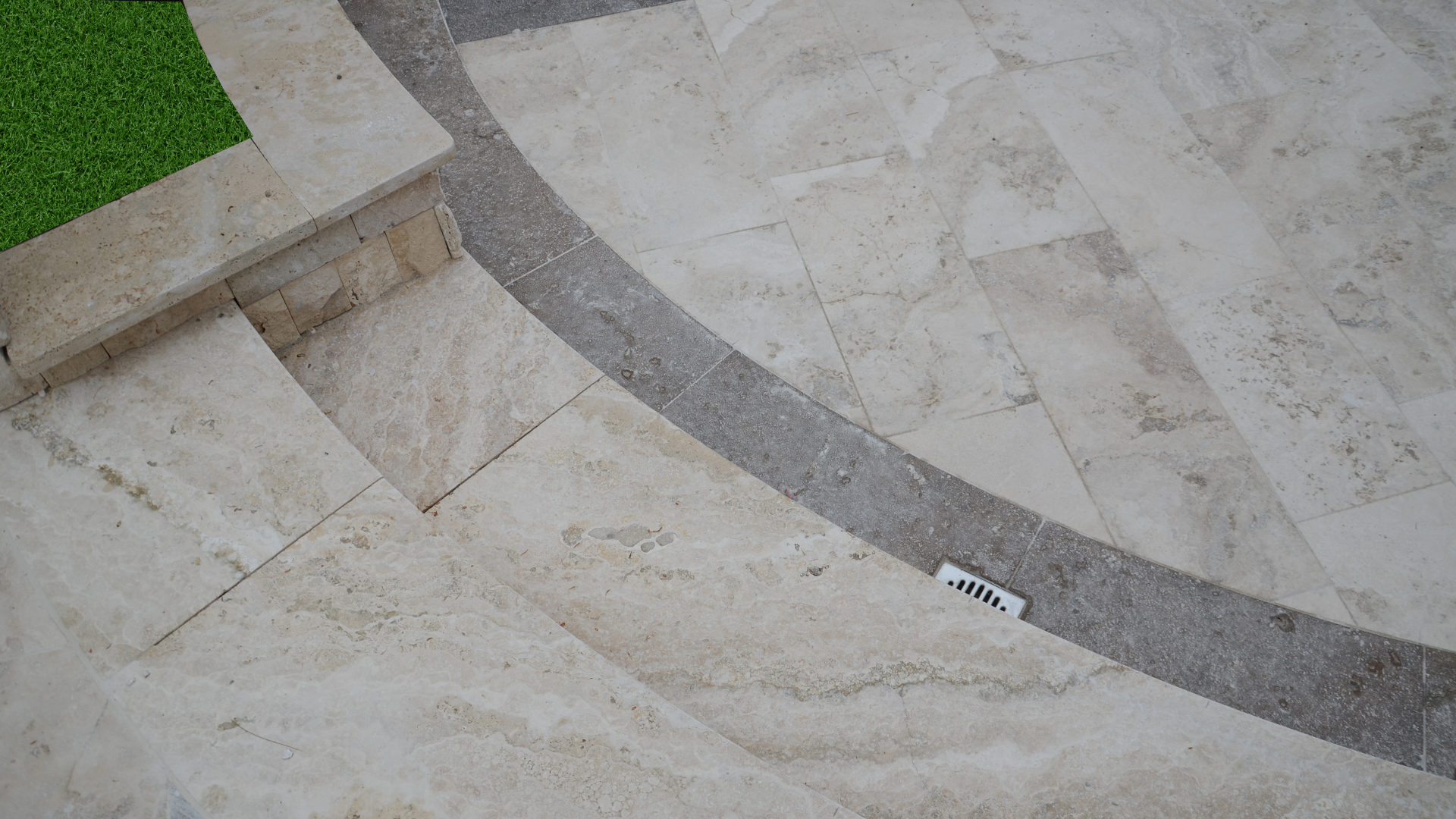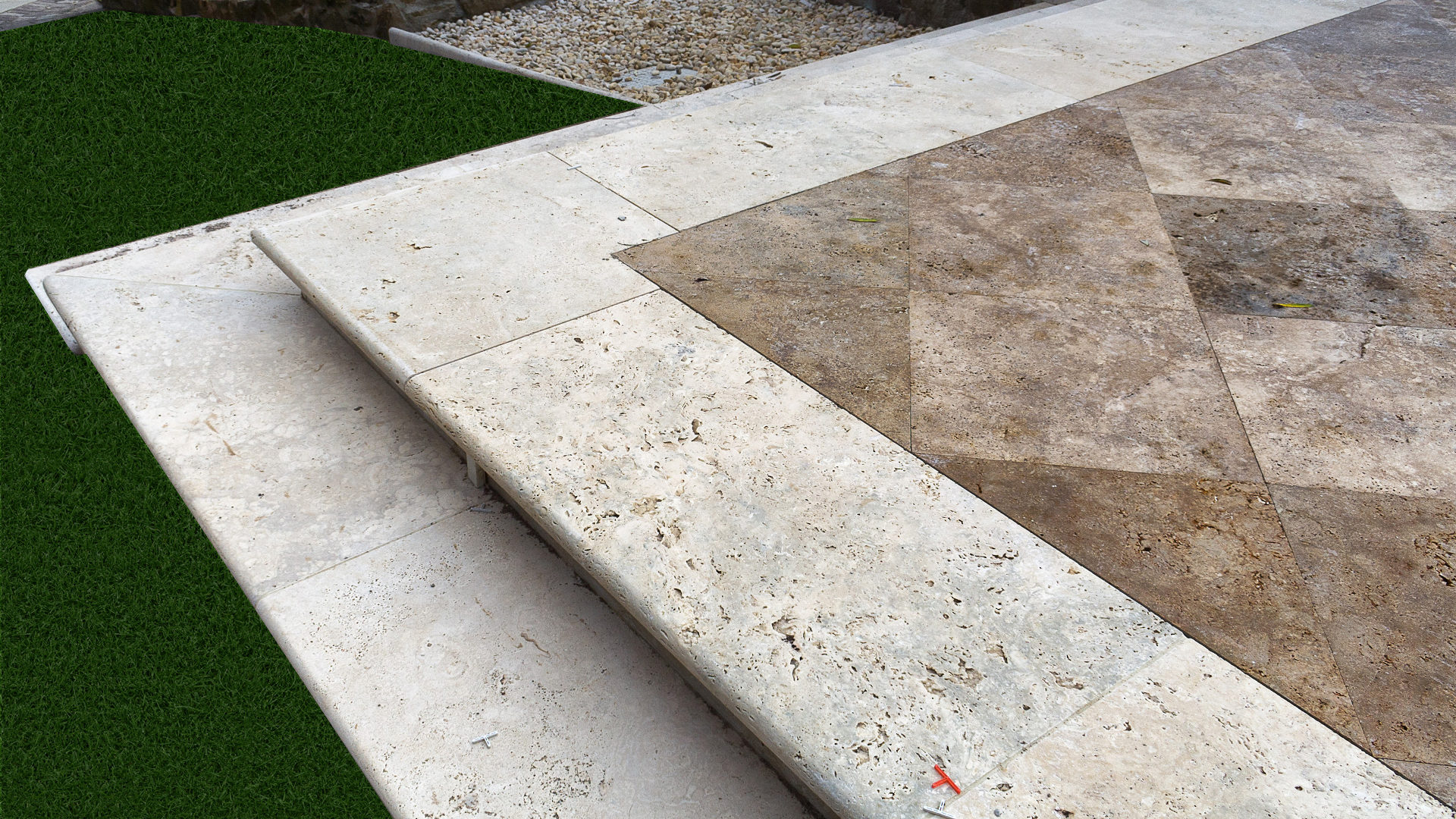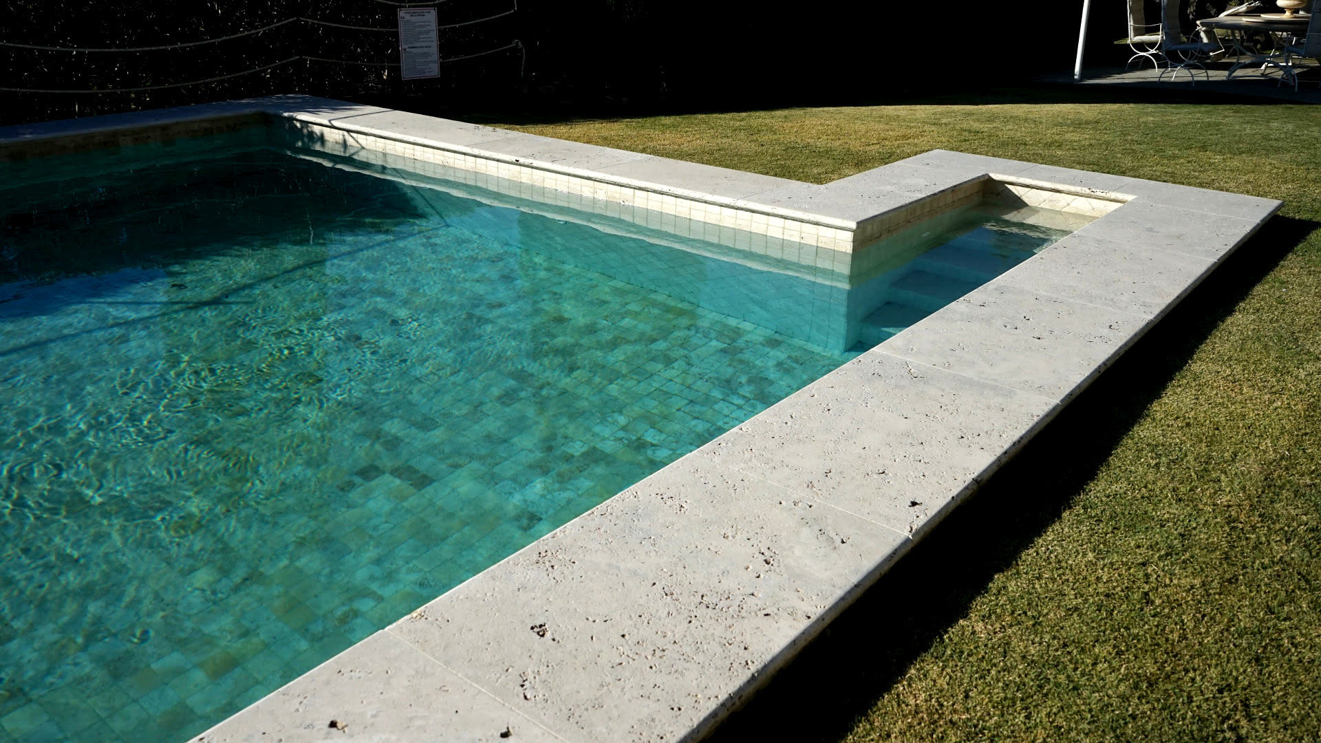 травертин , материал, который образуется в воде, идеально подходит для его изготовления. Его технические характеристики: антифриз , нескользкость даже во влажном состоянии , устойчивость к химическим веществам , присутствующим в бассейне, делают его особенно подходящим. для этого использовать.