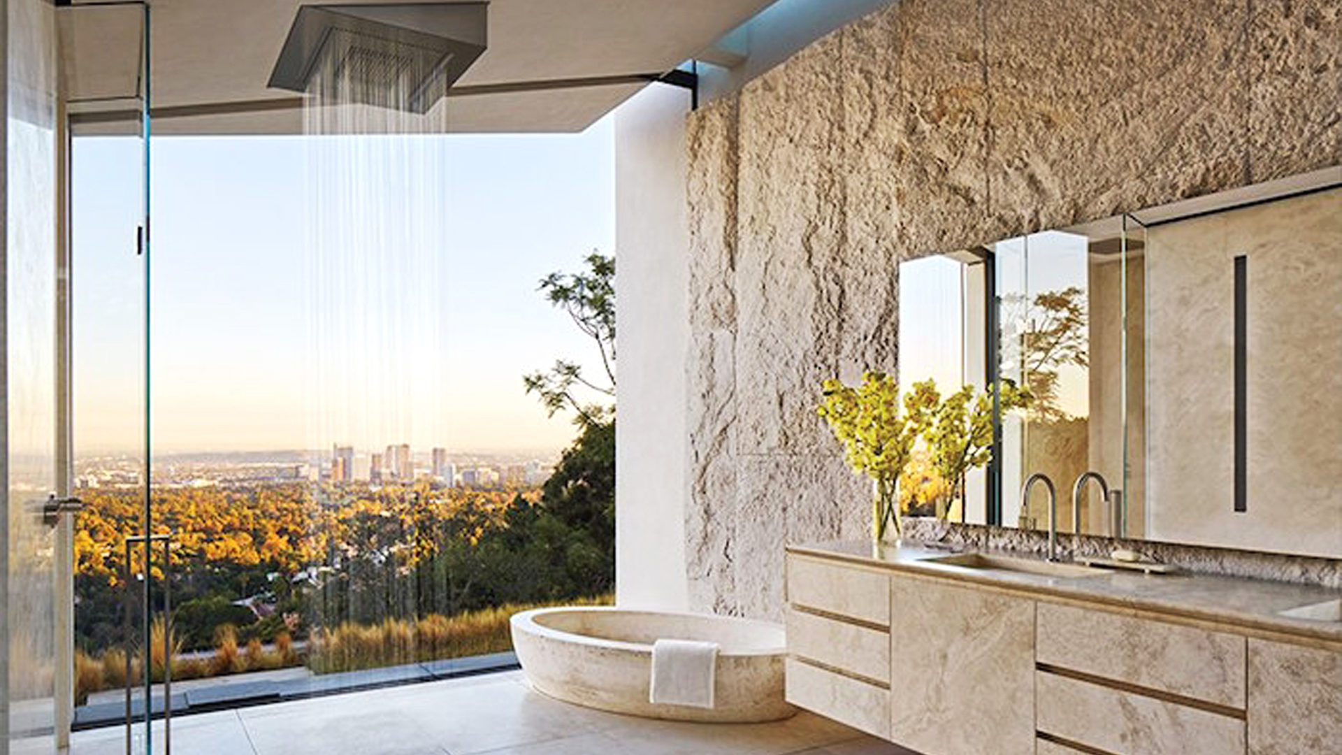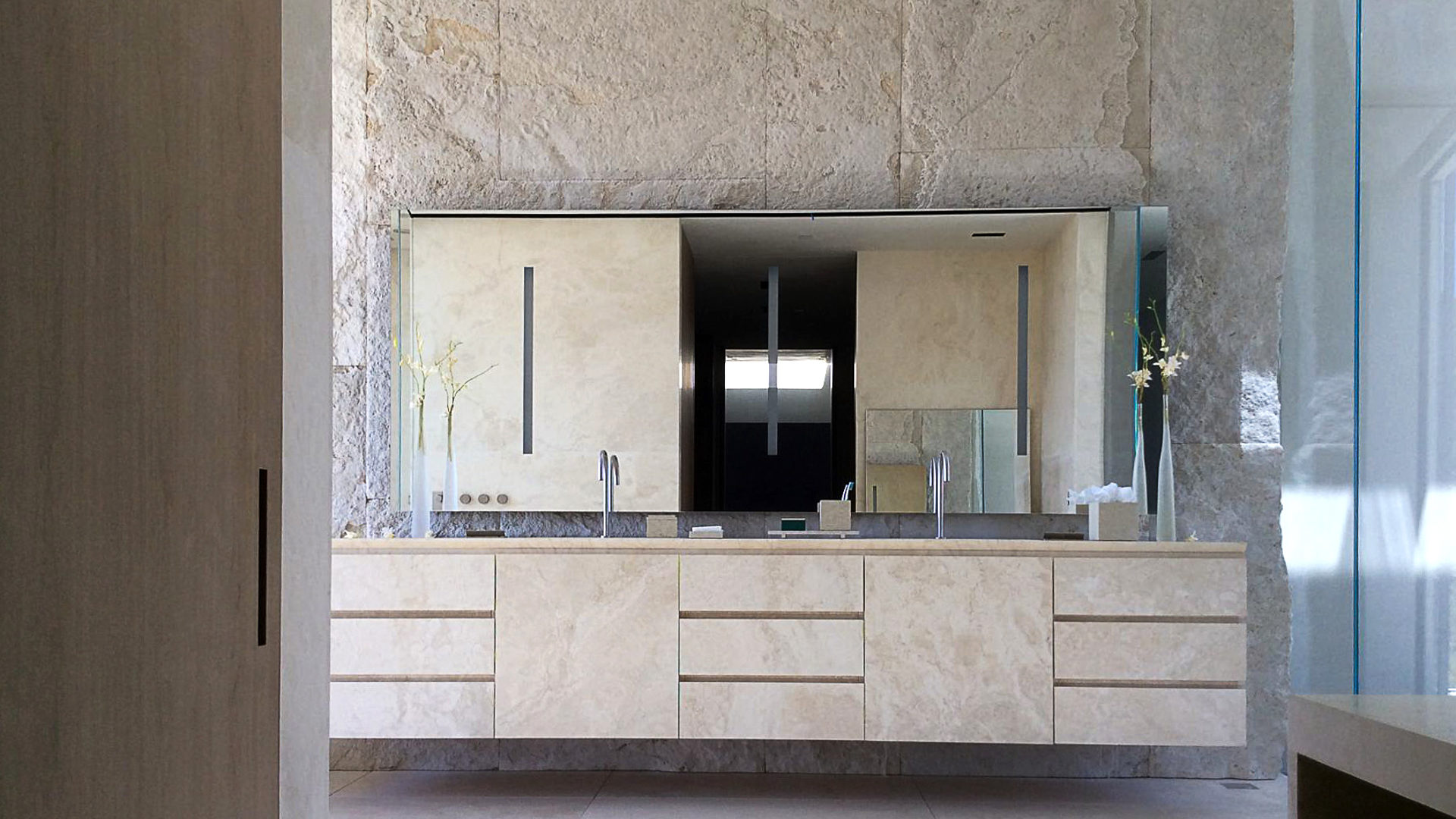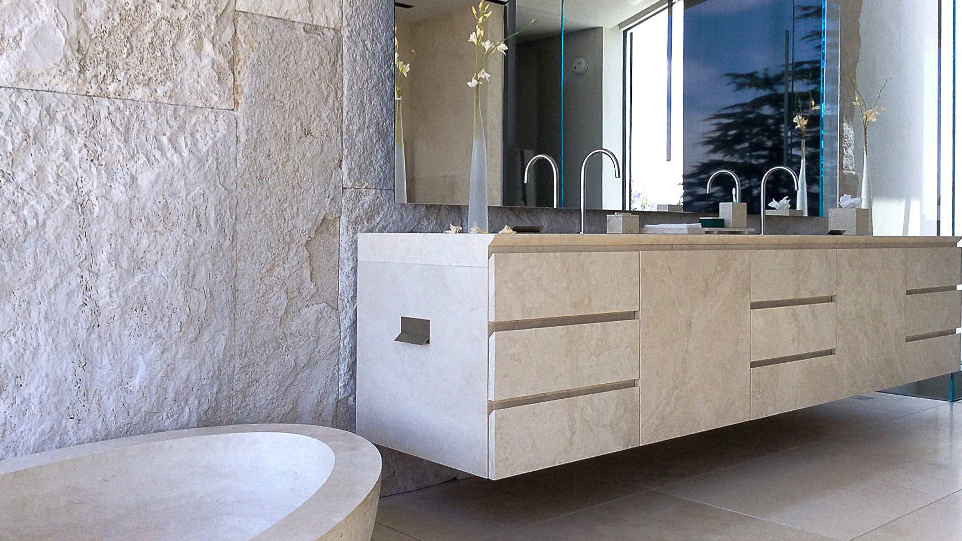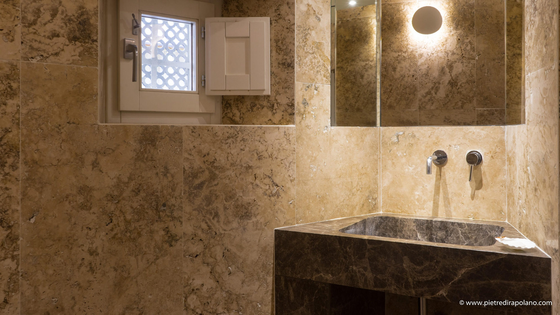 Плиты из травертина также можно смоделировать для создания столешниц для меблировки : почему бы не объединить их с умывальником из камня для естественного и эффектного результата?