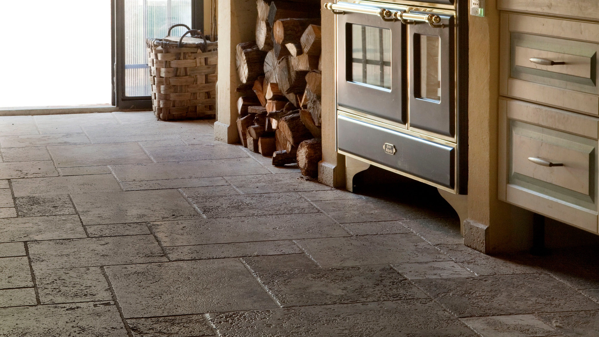 Каменные полы и стены на кухне