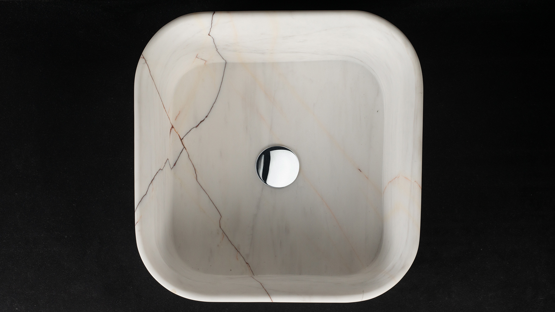 Новый квадратная раковина со столешницей в мраморе. Большая раковина с тонкий край , предложенная здесь в версии в Белый мрамор Альба с белым фоном и контрастными прожилками.