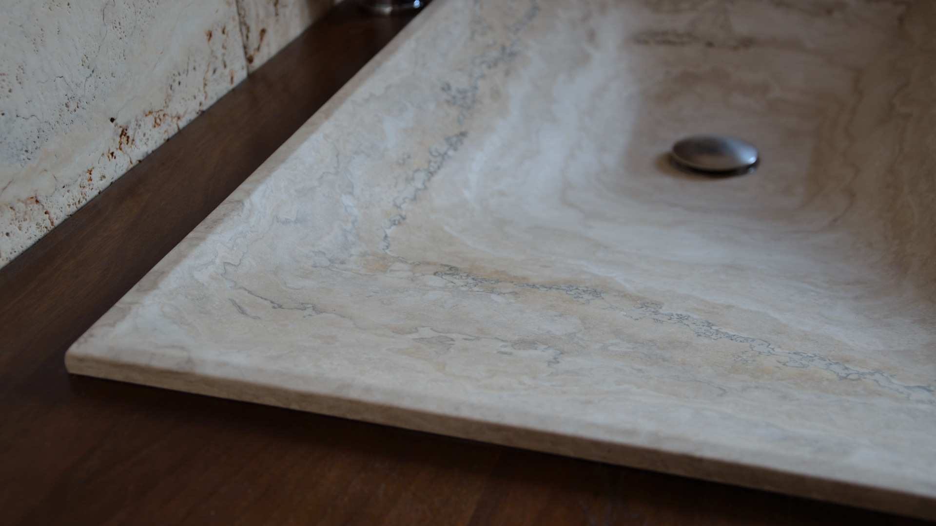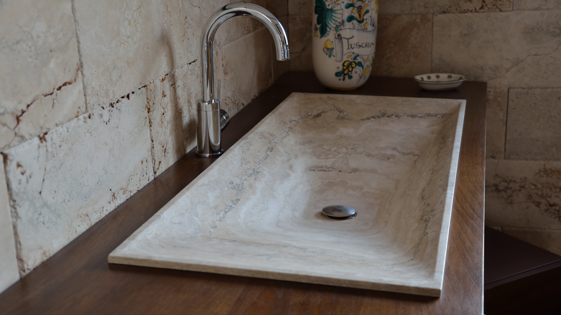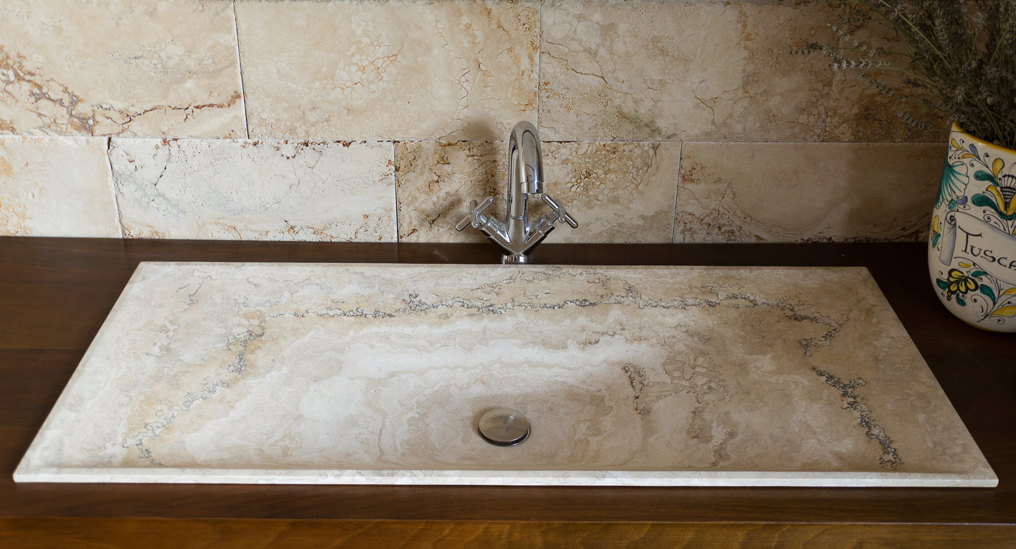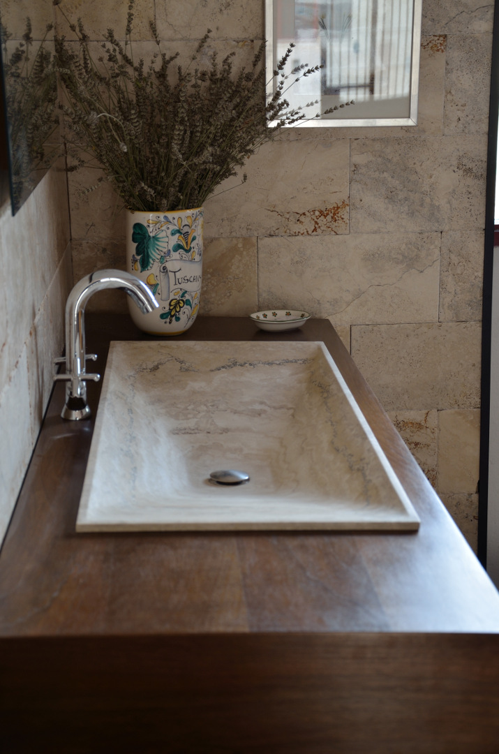 Прямоугольный встраиваемый умывальник в форме дзен из светлого травертина; разработано арка. Л. Полвани — один из бестселлеров нашей линейки умывальников.