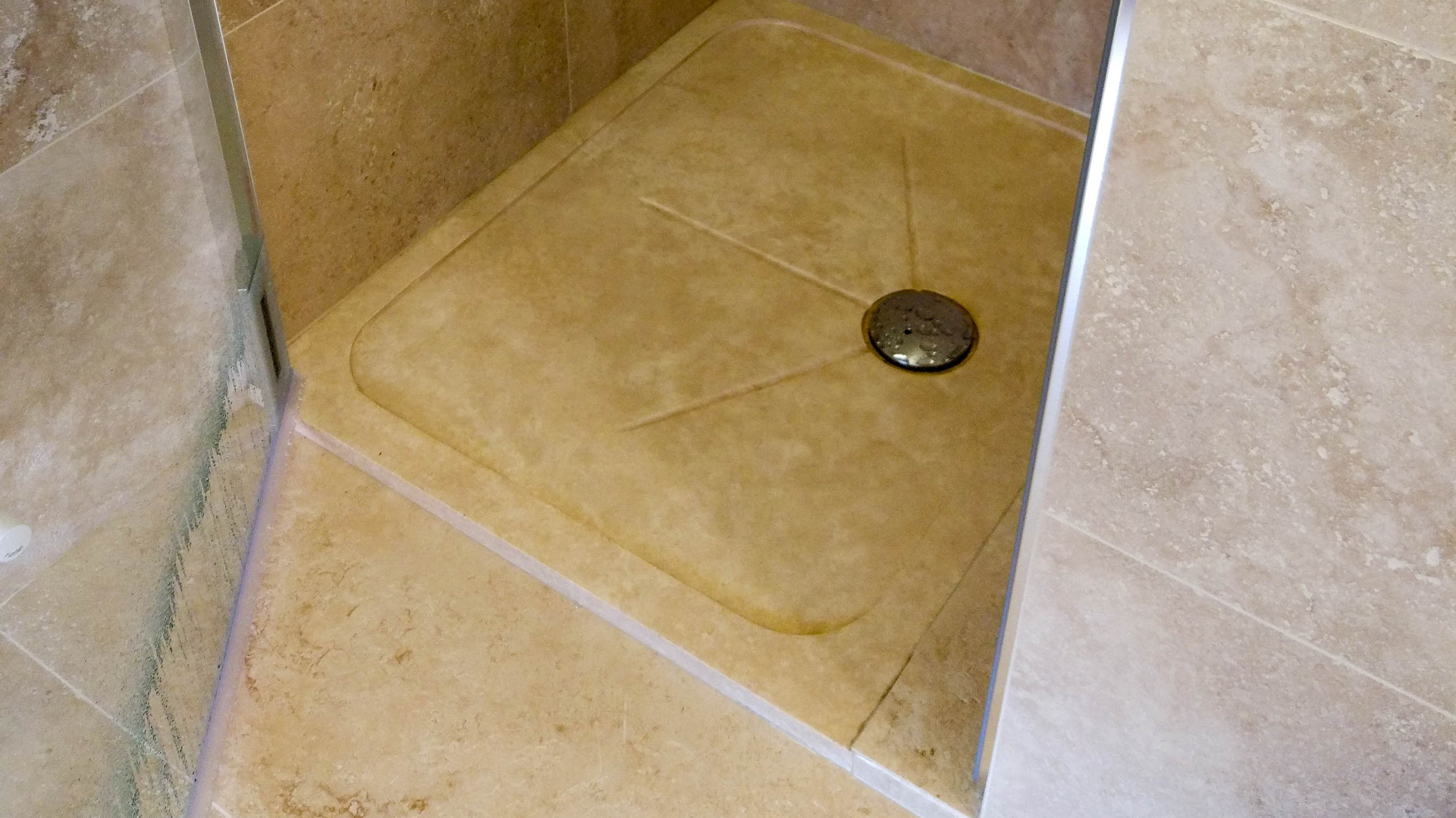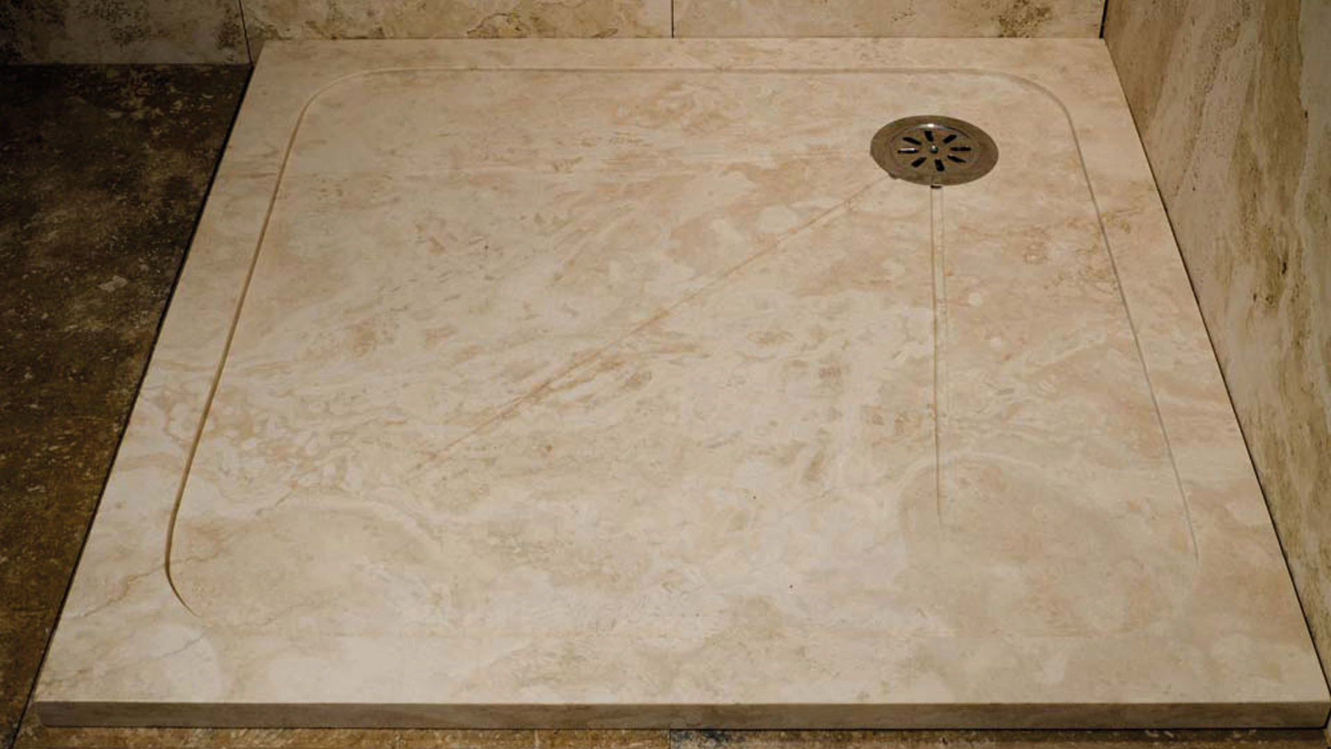 Тонкий душевой поддон из травертина. Легкие канавки на поверхности душевого поддона направляют воду в канализацию.