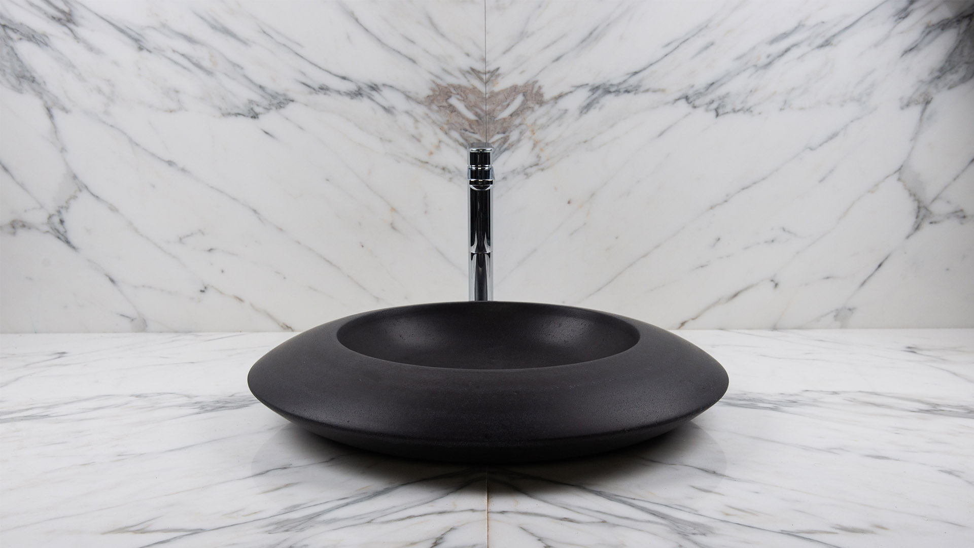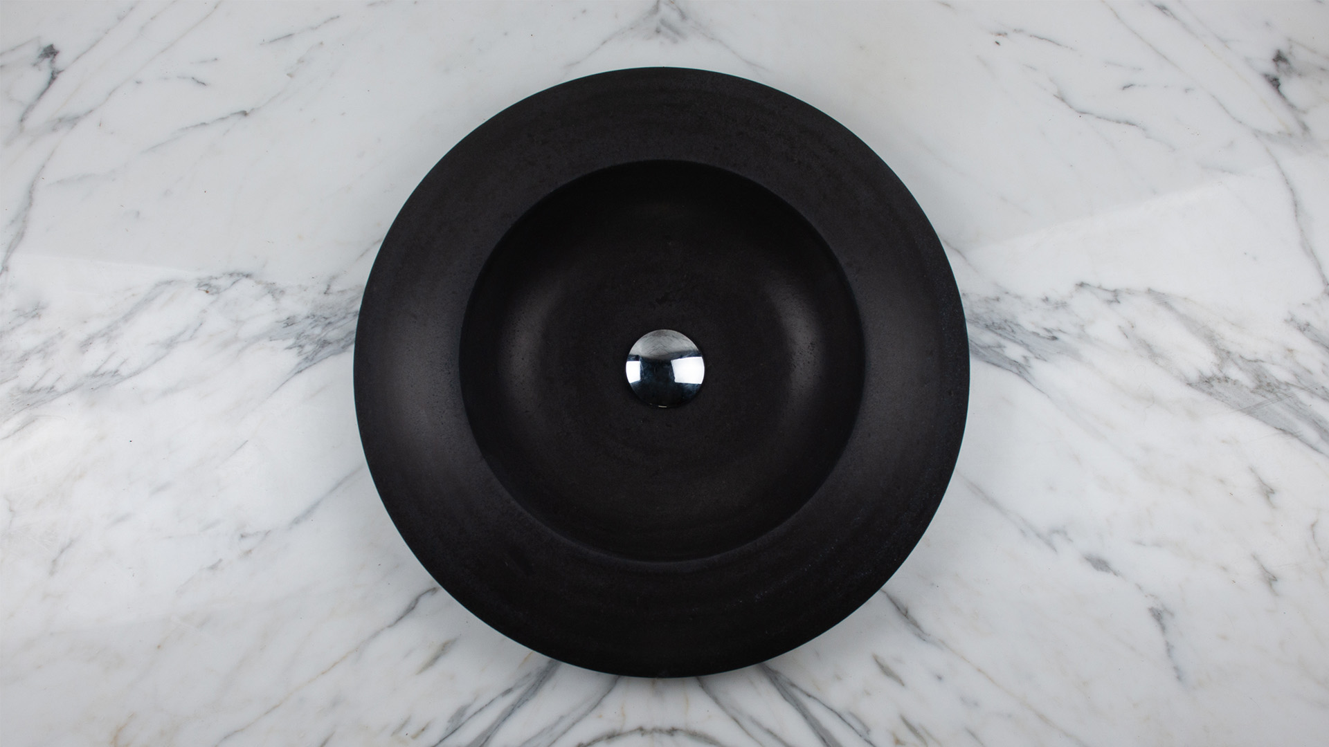 Черный базальт — очень стойкий материал вулканического происхождения. Черный цвет сочетается с мебелью и означает, что этот умывальник также может быть установлен в ванных комнатах с керамическими и керамогранитными покрытиями.