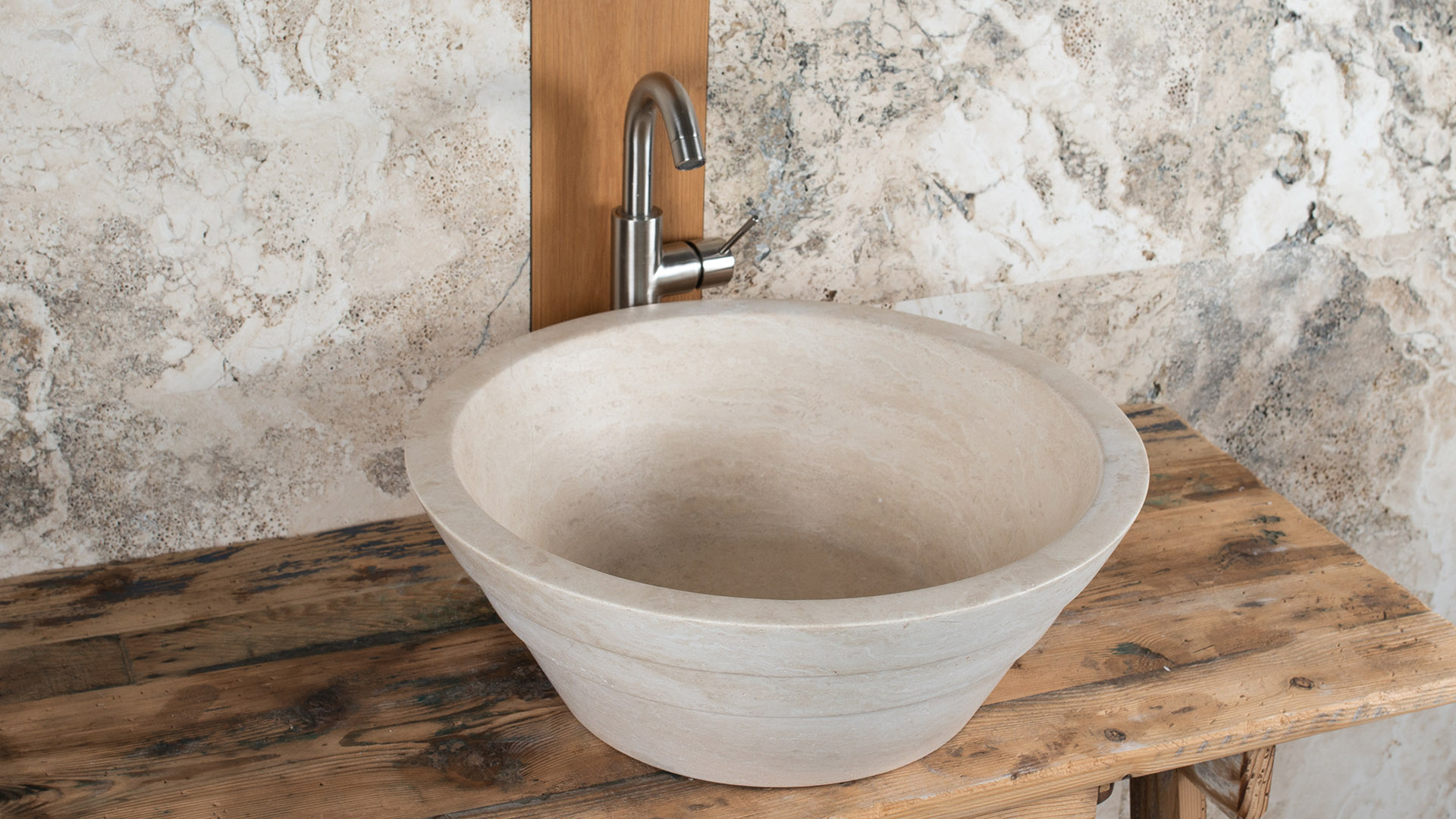 Для очистки этого продукта всегда используйте нейтральное мыло. Не используйте средство для удаления накипи, чтобы не повредить отделку поверхности. Мрамор, камни и травертин состоят из большого количества карбоната кальция, который может подвергаться воздействию кислотных продуктов.