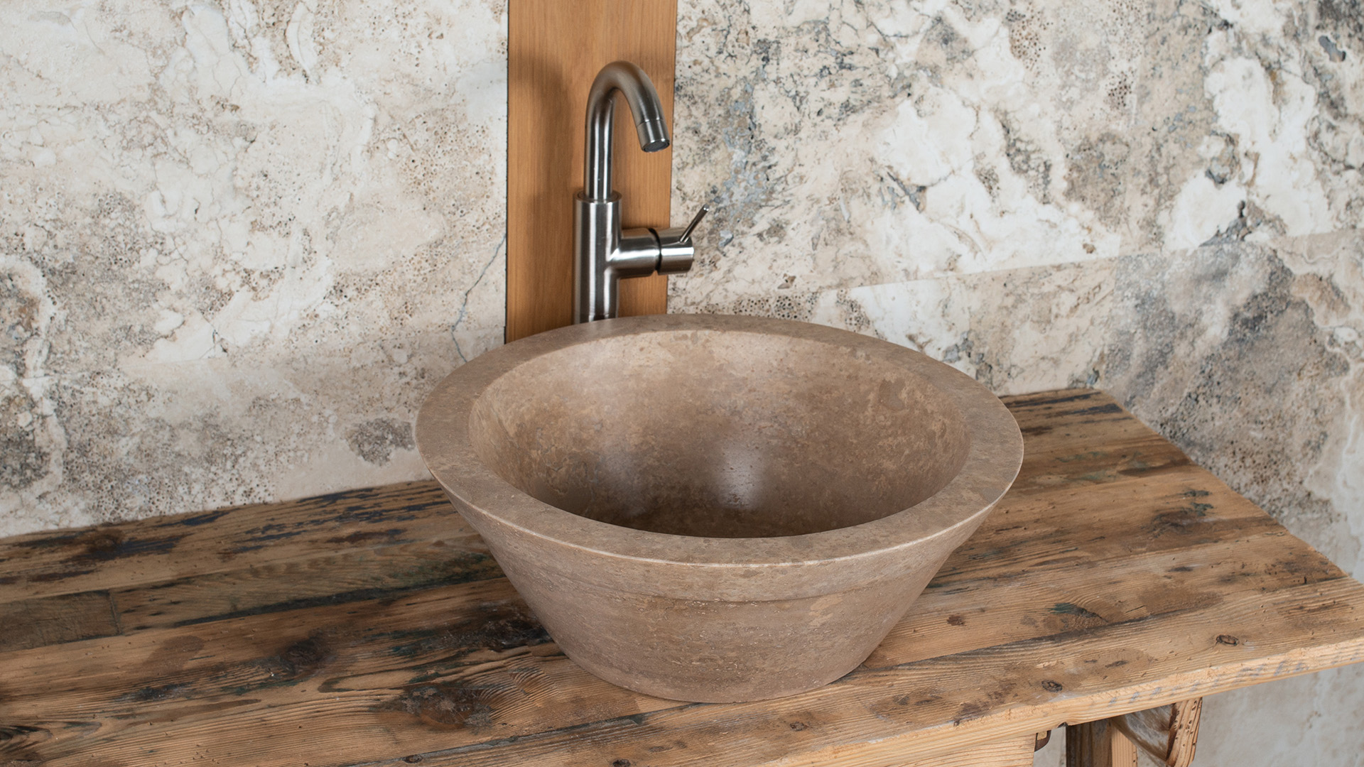 Круглая мойка из темного травертина из орехового дерева. Он также изготавливается из светлого классического травертина и может быть установлен как полуутопленный на столешницу из натурального камня или дерева, так и сверху.