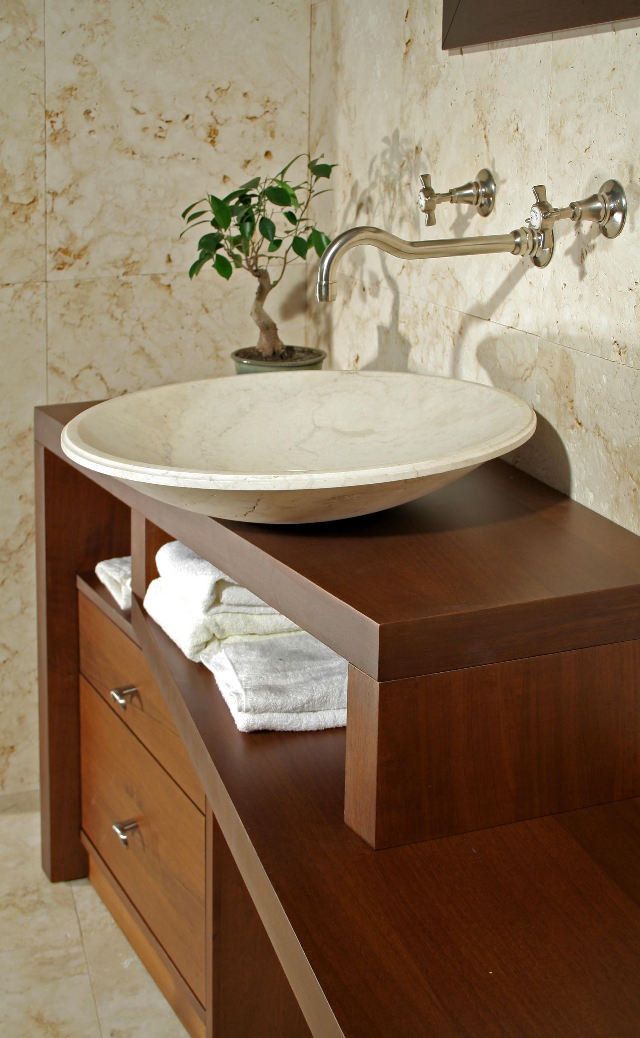 Умывальник из массива Pietra di Rapolano имеет размеры Ø50xh10 см и был подвергнут грязеотталкивающая обработка .