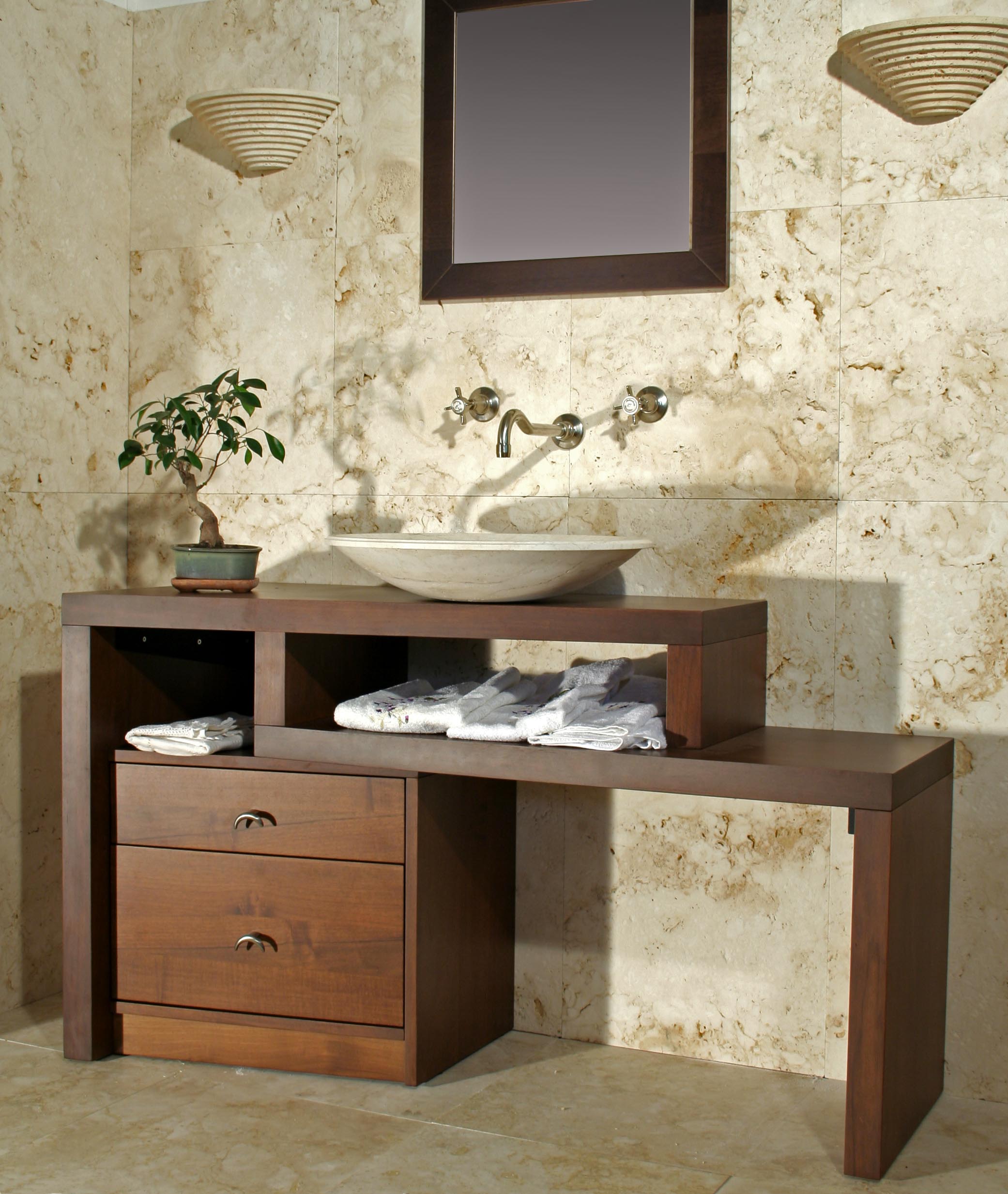 Композиция из дерева и камня «Таварнелле» включает в себя умывальник из светлого травертина это мебель для ванной из морской фанеры, шпонированной орехом, с двумя ящиками для предметов.