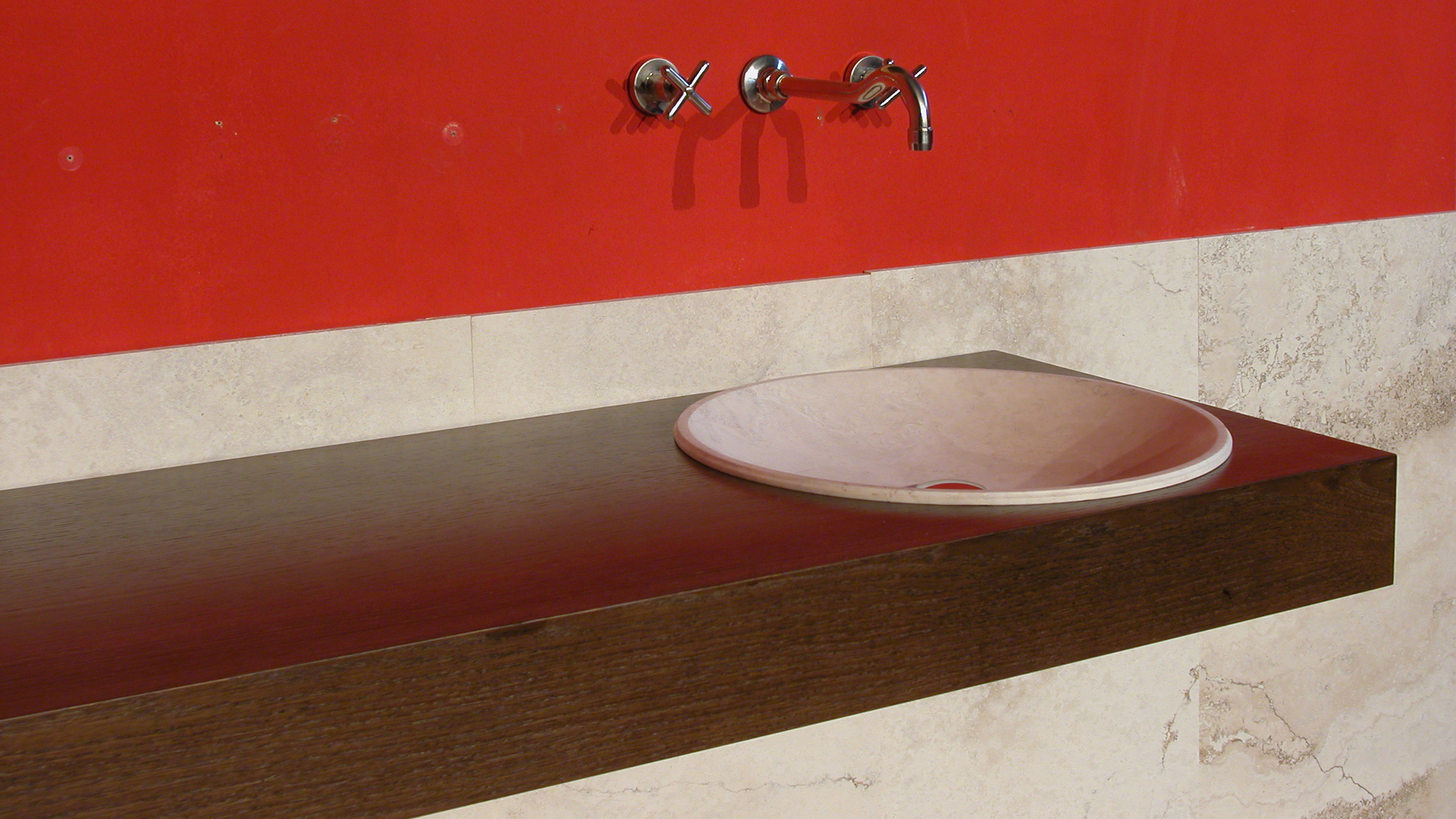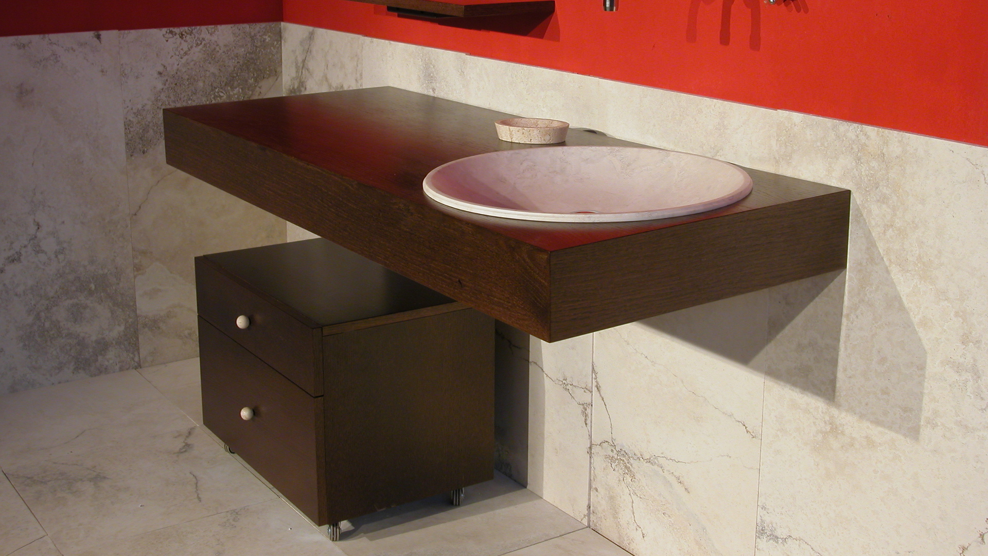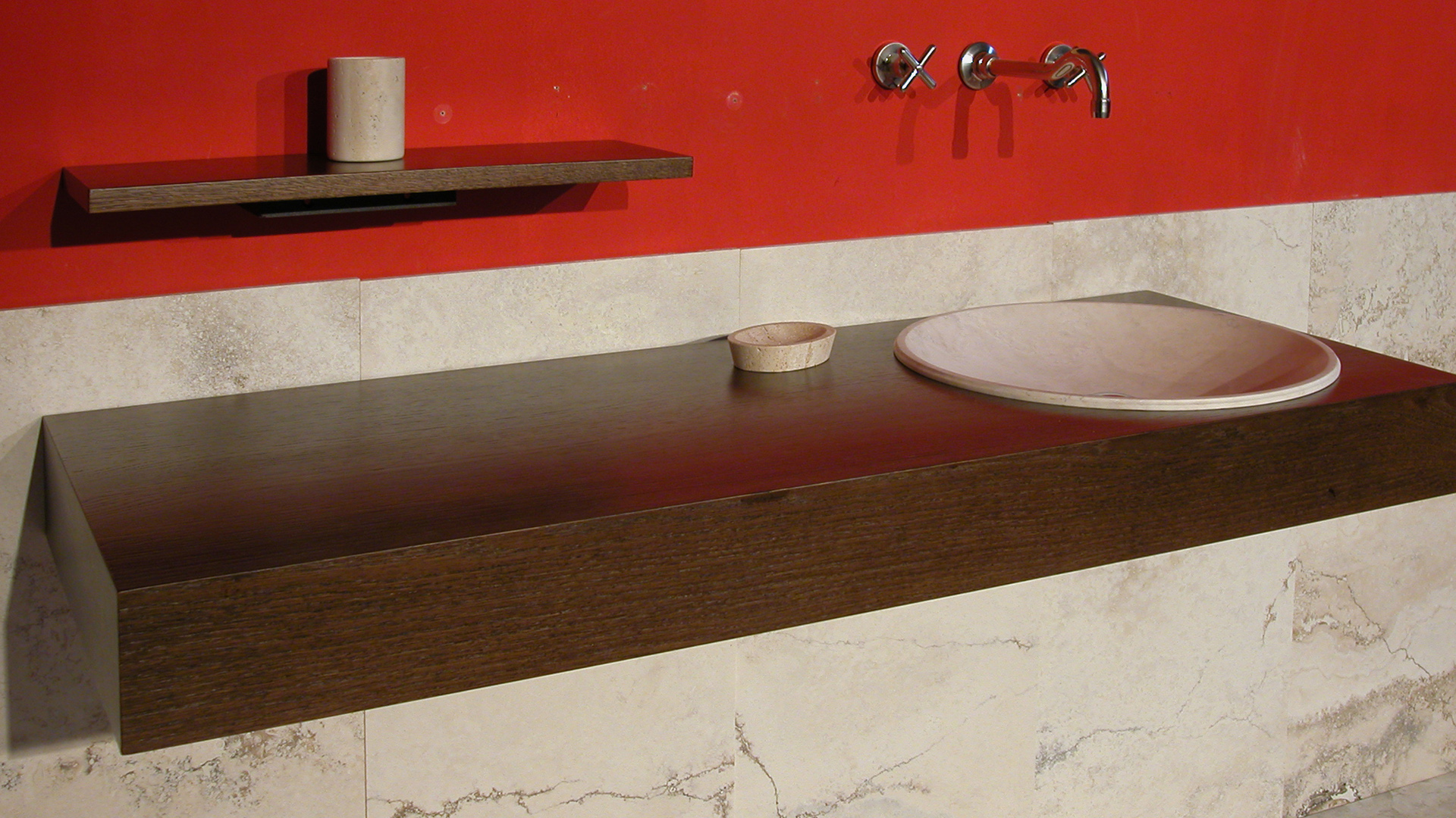 Cedda — шкаф для ванной в грецкий орех с умывальником из светлого камня Раполано. Размер столешницы можно адаптировать к любому пространству. Эта композиция также хорошо подходит для использования с двумя умывальниками. Включено в эту статью: