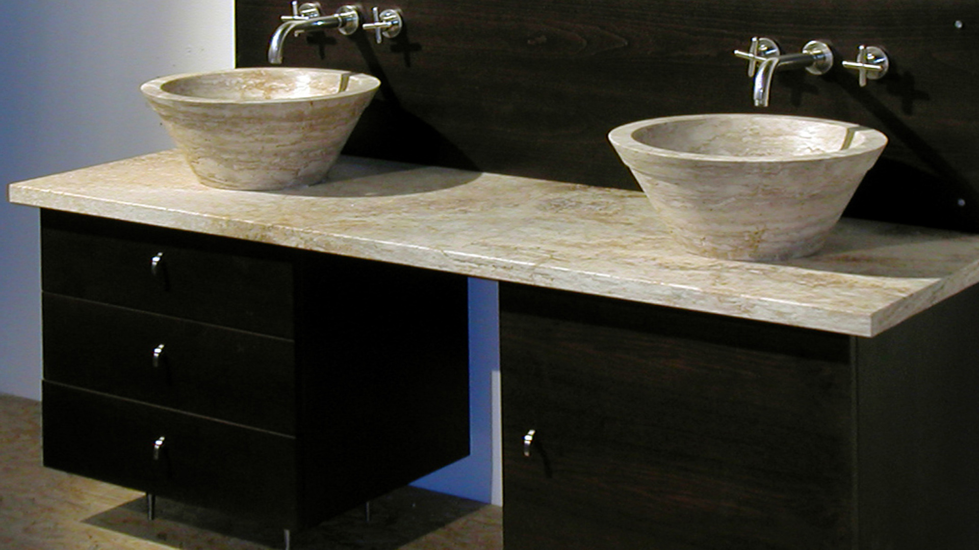 Gaiole — это шкаф для ванной со столешницей из травертина и двумя раковинами из светлого камня. Смесители устанавливаются на деревянную панель, входящую в состав композиции.