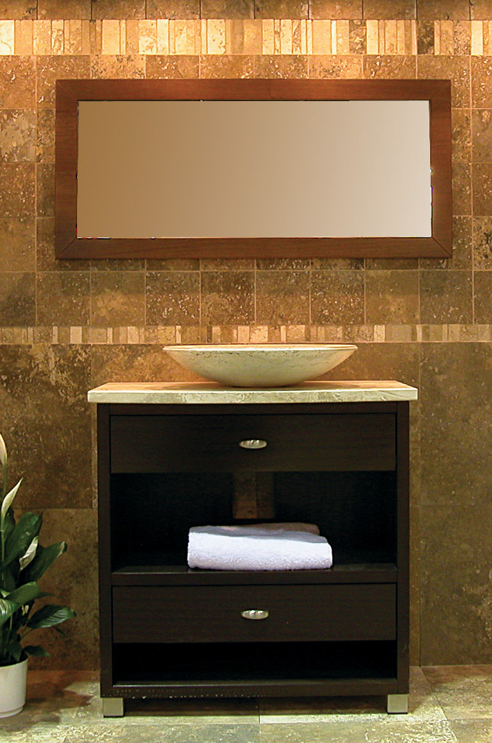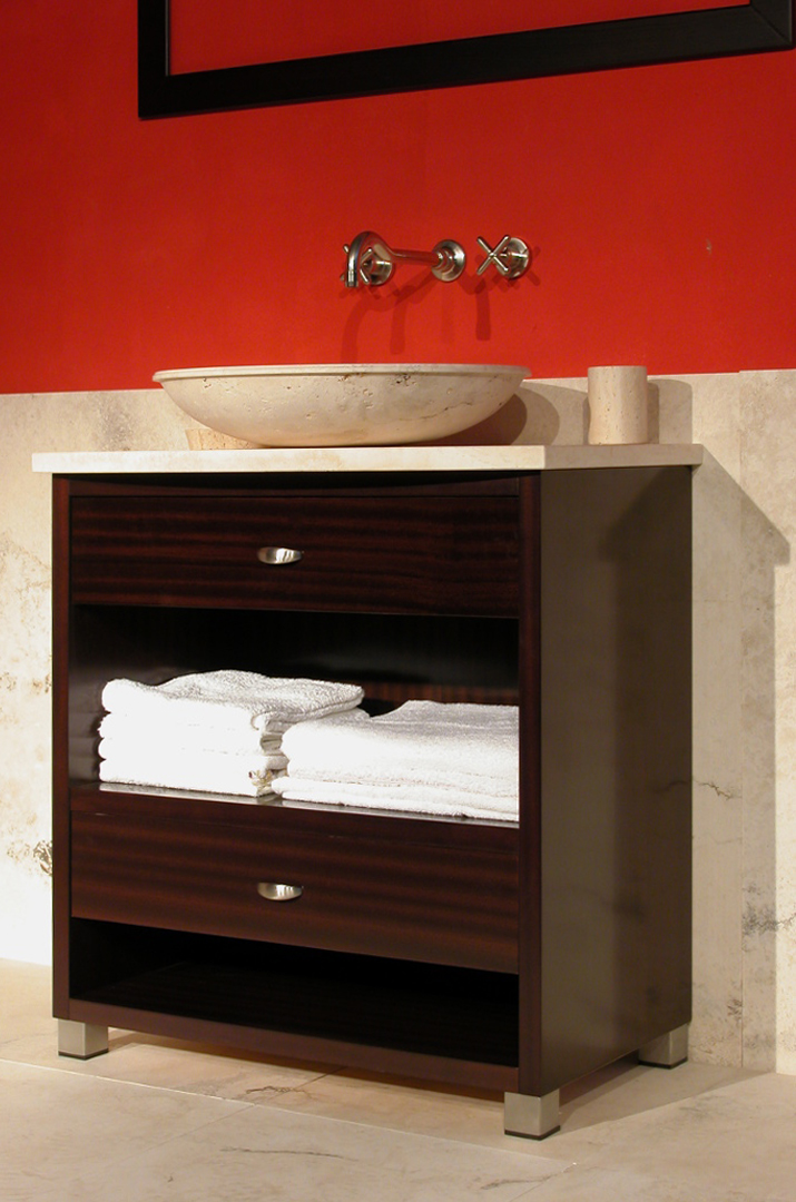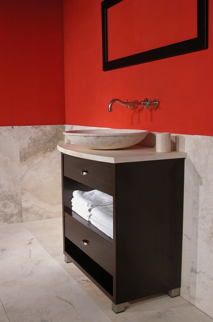 Шкаф для ванной Фонтерутоли это композиция из шпонированной морской фанеры. темное красное дерево с двумя ящики для предметов и полка держатель для полотенец ; Столешница и умывальник выполнены из светлого камня Раполано с антикоррозийной обработкой.