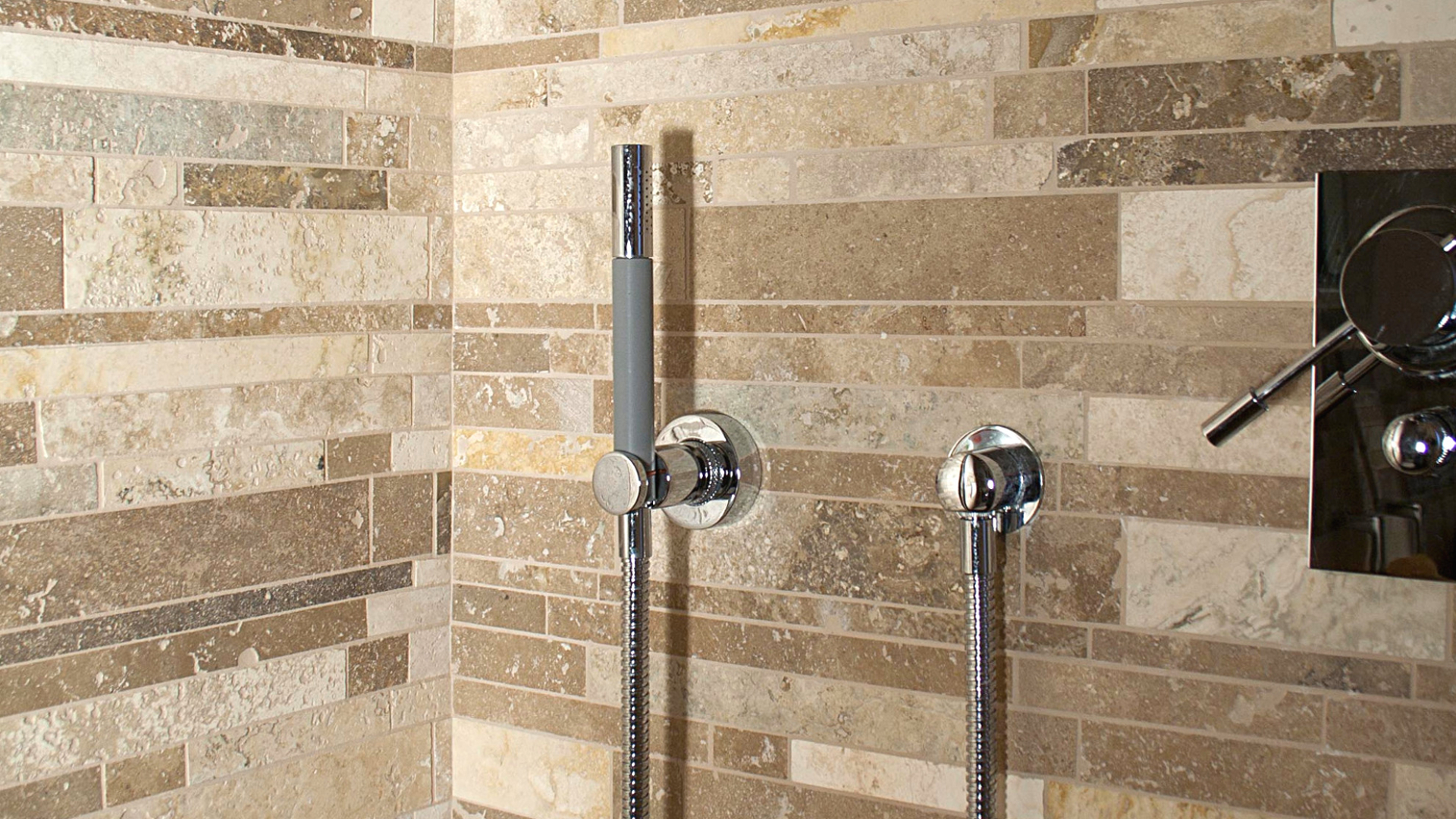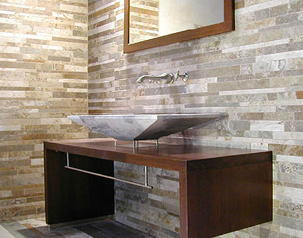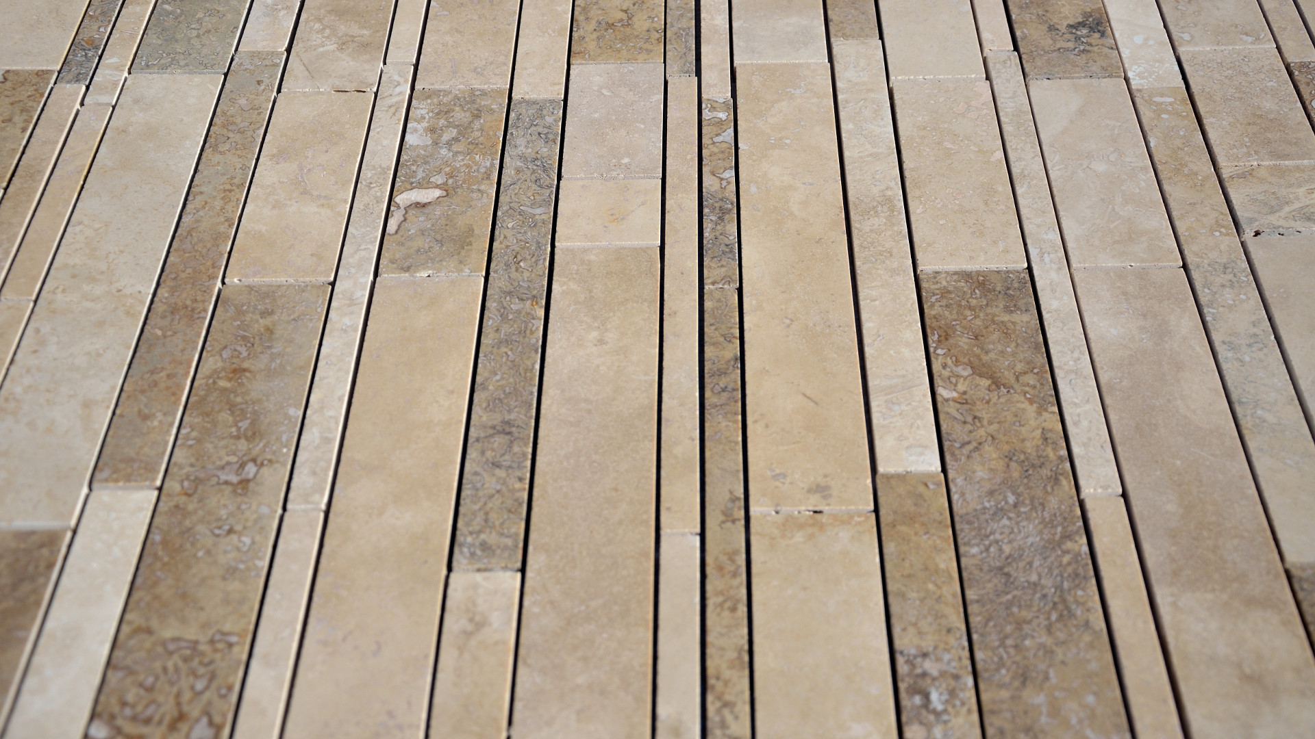 Мозаика с полоски травертина различных размеров, объединенных вместе, чтобы образовать «древнюю» поверхность. Эти полосы выбираются из травертина различных оттенков, а затем собираются на сетку, чтобы облегчить их установку.
