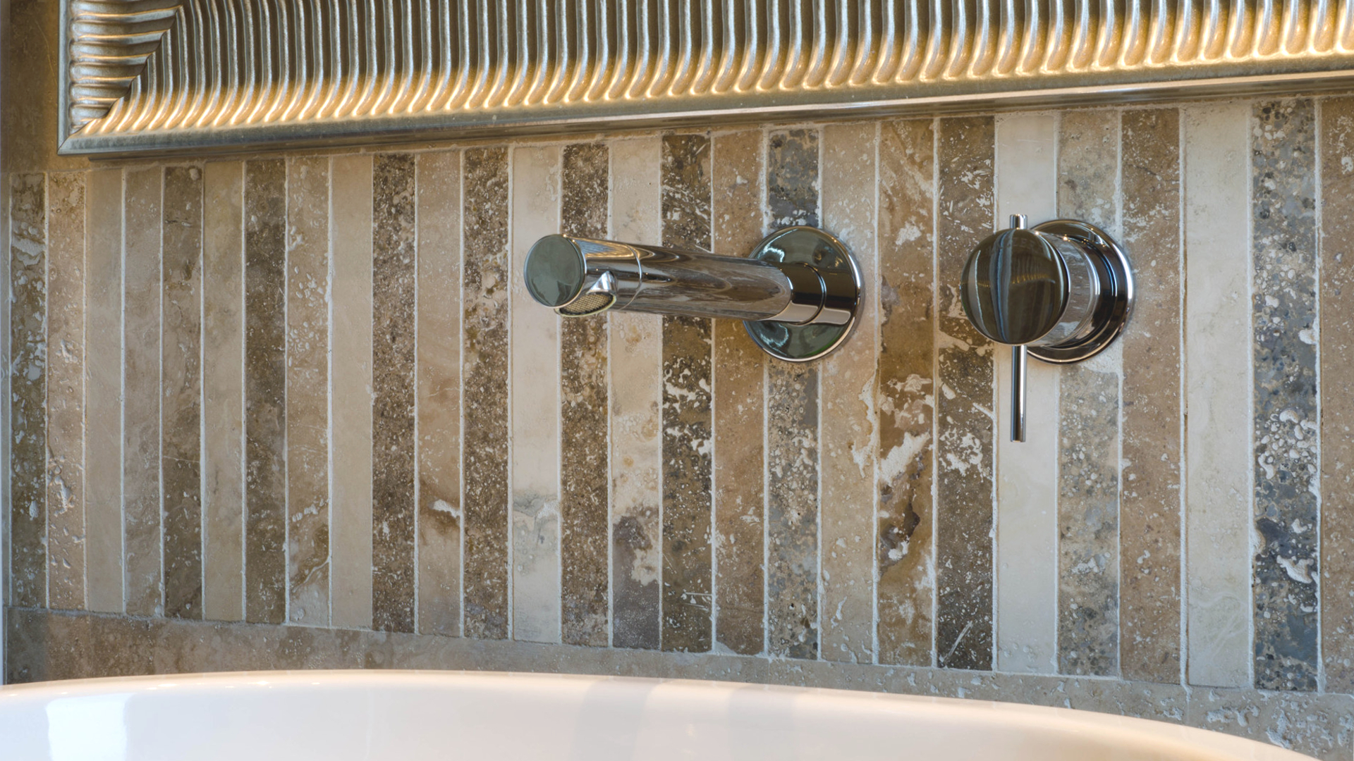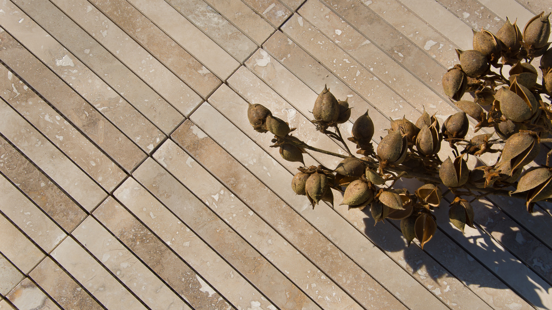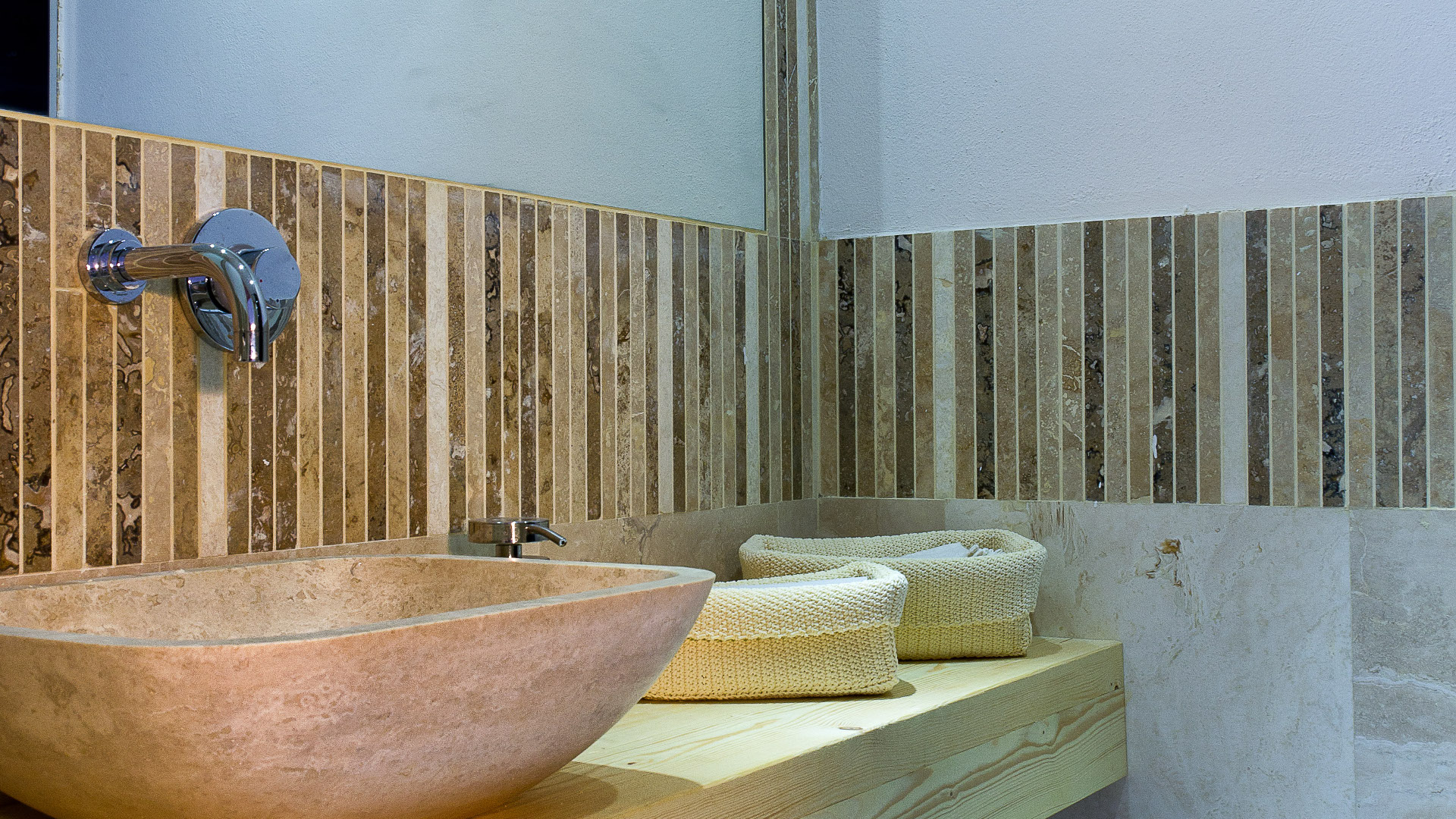 Мозаика с большим полоски травертина выбранные в различных оттенках, а затем искусно смешаны. Эти полоски 2,5 х 45,5 см, приклеены к специальной опорной сети, которая держит их вместе. Поставляется в виде листов размером 45,5 x 30,5 см и толщиной 1,2 см.