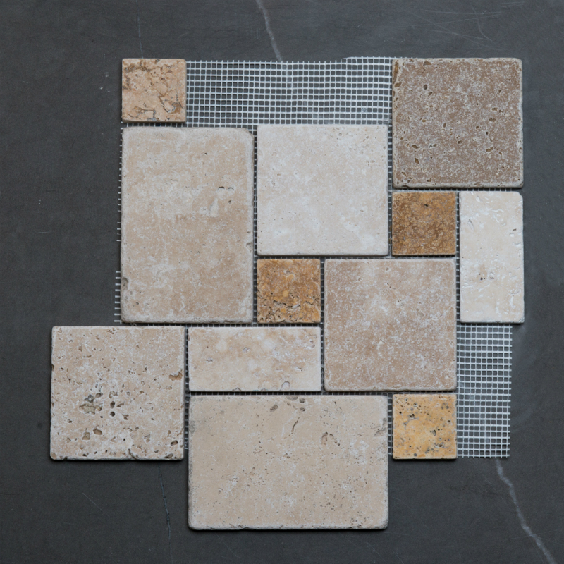 Mini Comp 40 Multicolor Blend — это композиция различных форматов предварительно собранные плитки травертина на сетке в листах, которые подходят друг к другу: он принимает геометрию нашего типичного COMP40, но в уменьшенном масштабе.
