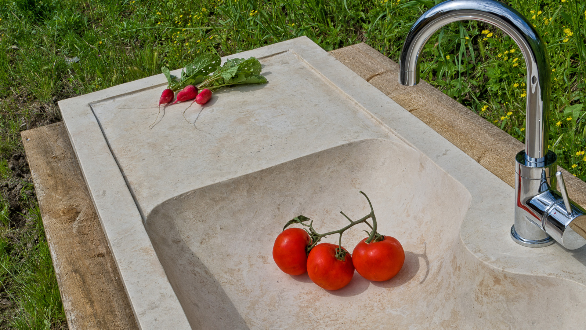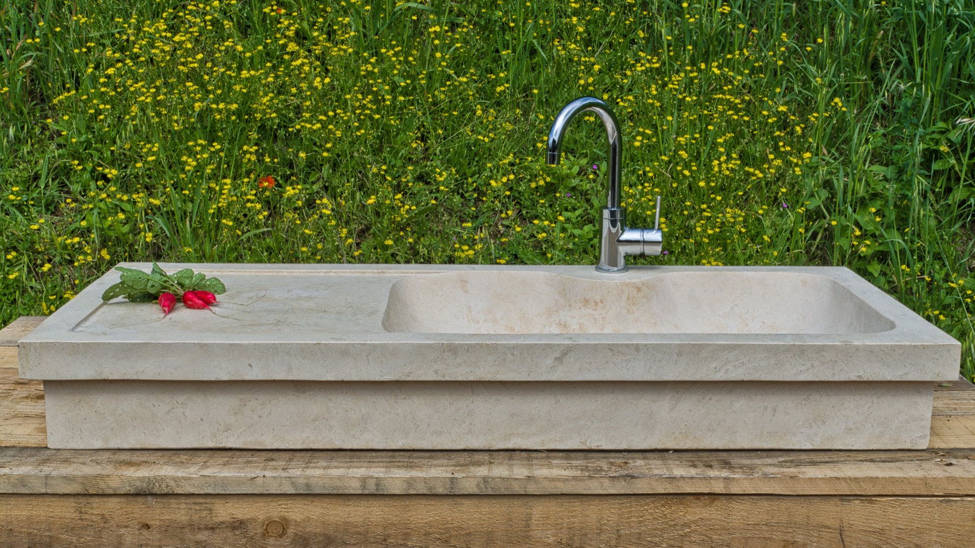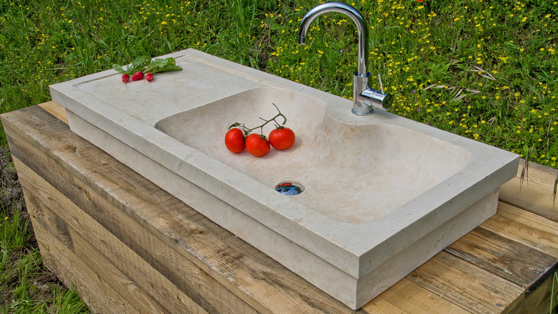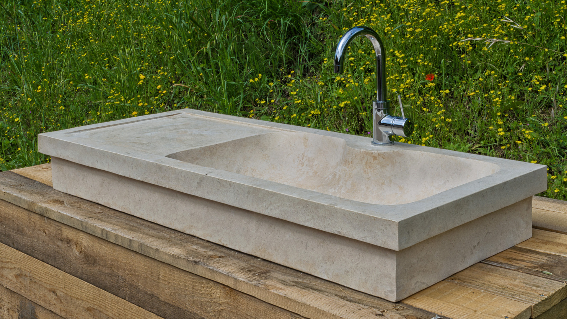 Мойка из травертина с закругленным прямоугольным отверстием e гладкая сушилка для посуды , это современная интерпретация классической каменной мойки: формы стали более линейными, а декоративные элементы отсутствуют.