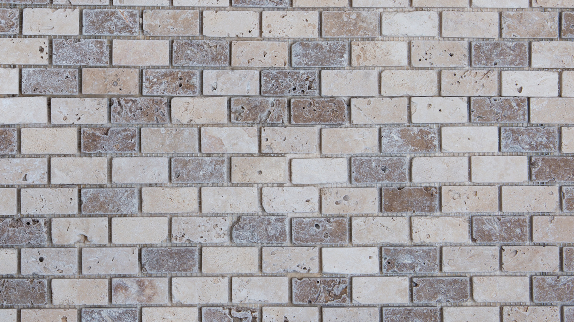 Мозаика из травертина с прямоугольными плитками размером 2,5 х 5,0 см, установленными на сетке. «Тоскана Микс» — это смесь травертинов коричневого, бежевого, светлого цветов.