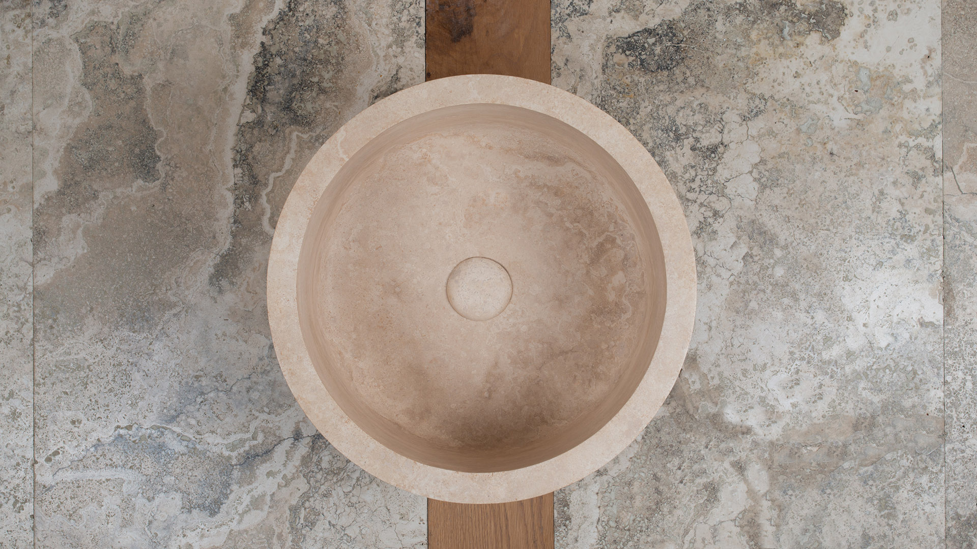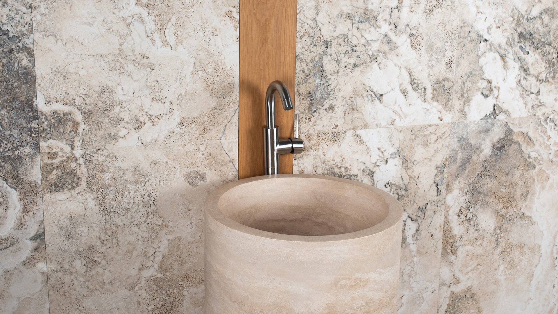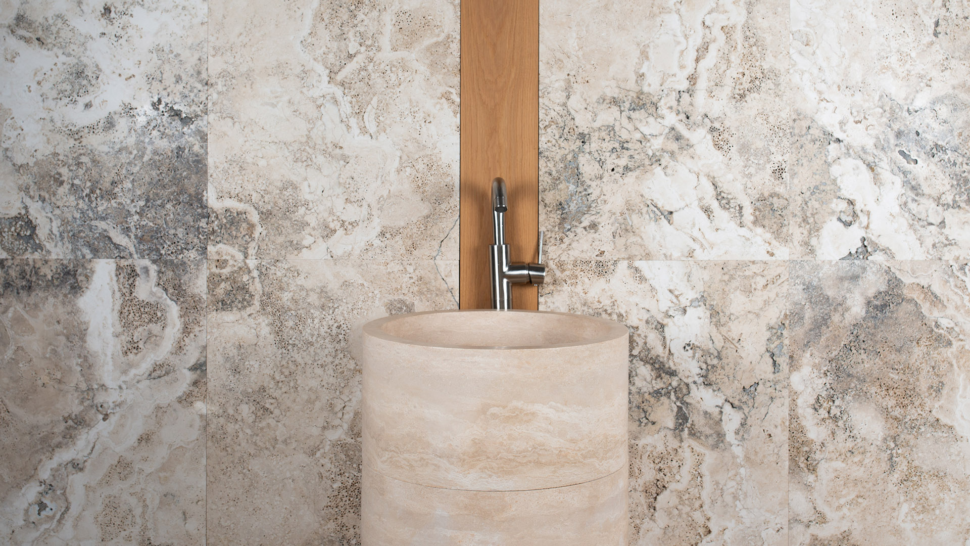Классическая раковина из травертина цилиндрической формы: это 4 цилиндра из резного камня, установленные один над другим, что придает ей монолитный вид.