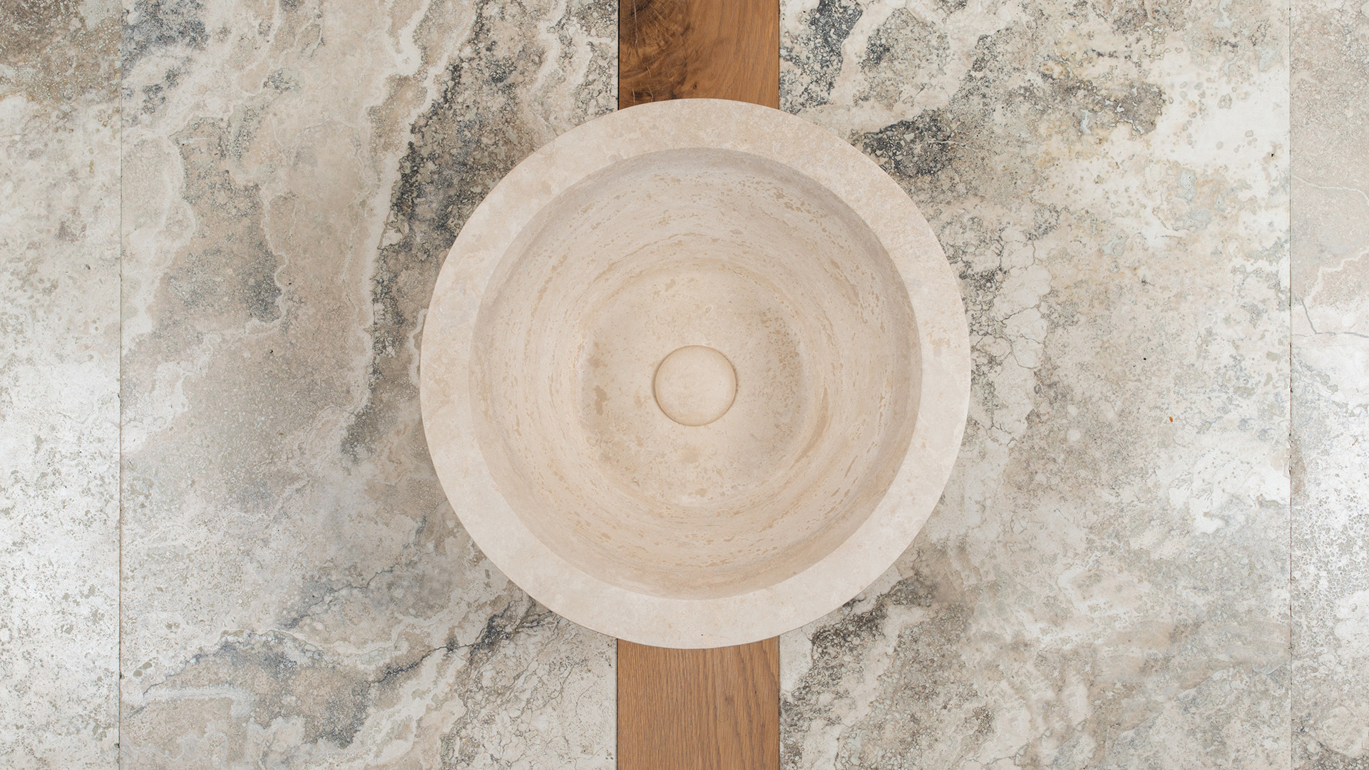 Круглая мойка из травертина из камня Rapolano, для использования в качестве столешницы или полуутопленной на каменной столешнице. Он также производится из травертина темного ореха.