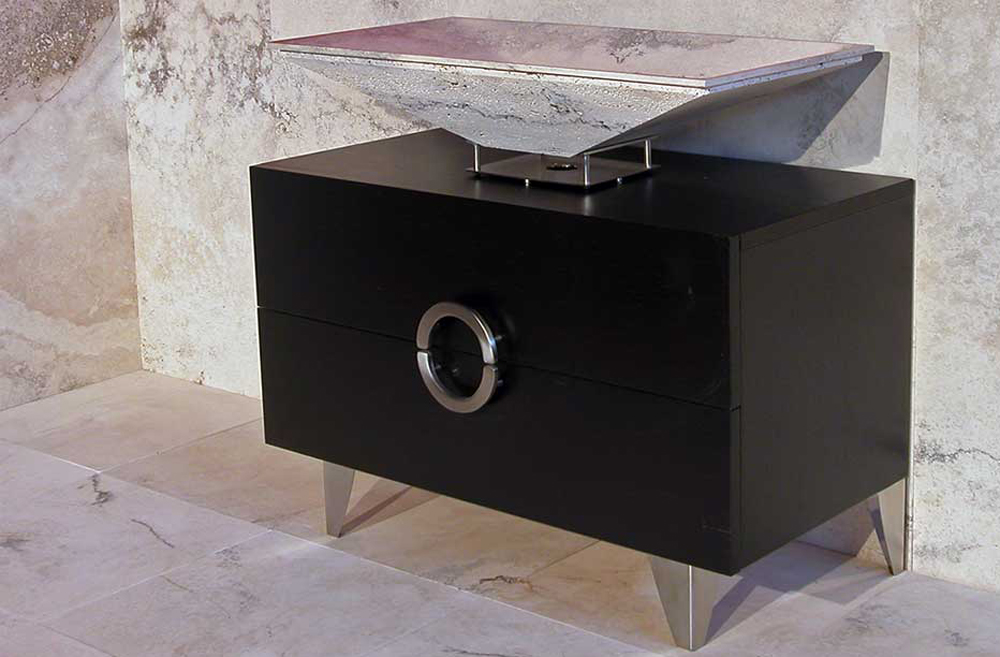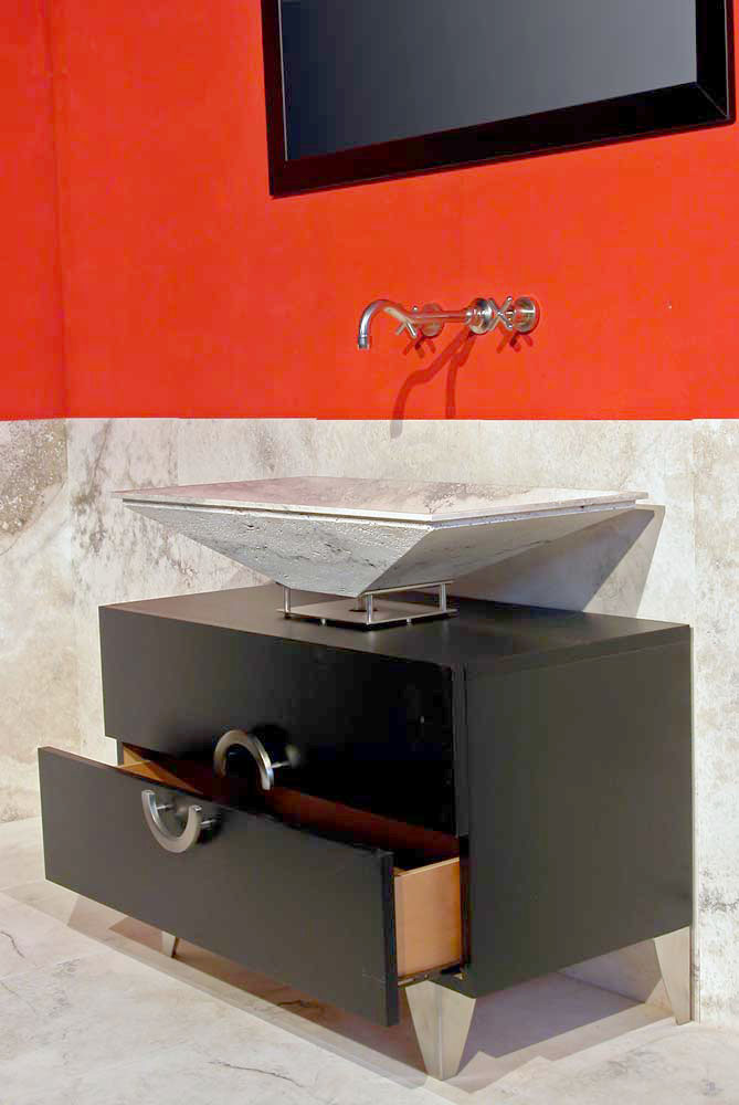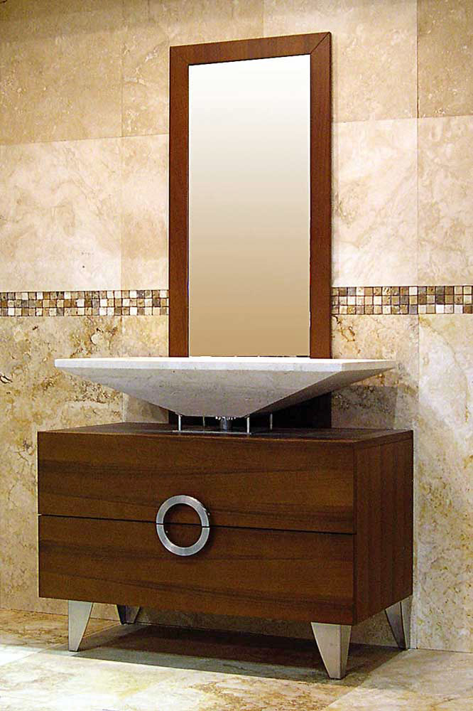 В Мебель для ванных комнат Linari современная композиция в дерево и травертин из морской фанеры, шпонированной венге, с двумя широкими ящики для предметов , массивный умывальник из светлого камня Rapolano с антикоррозийной обработкой.
