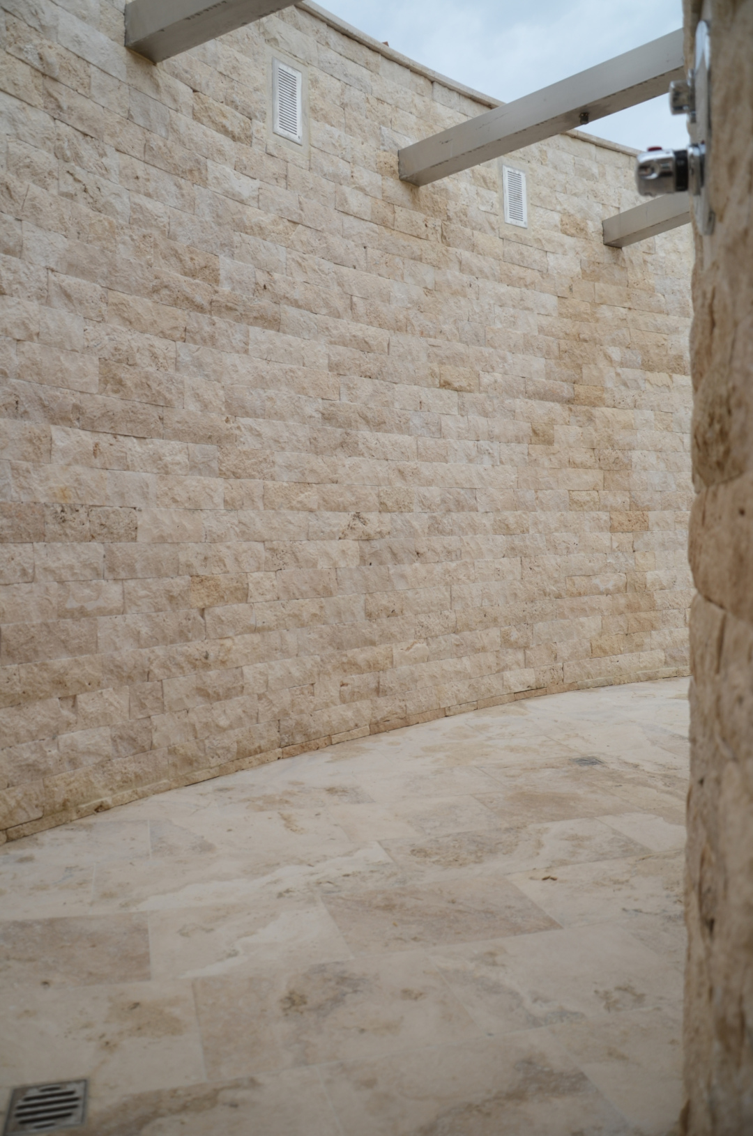 Душевые на открытом воздухе, сиденья, соединительные лестницы на разных уровнях также были сделаны из травертина Бекагли Кьяро (код PDR006).