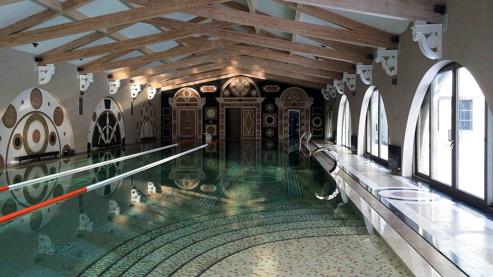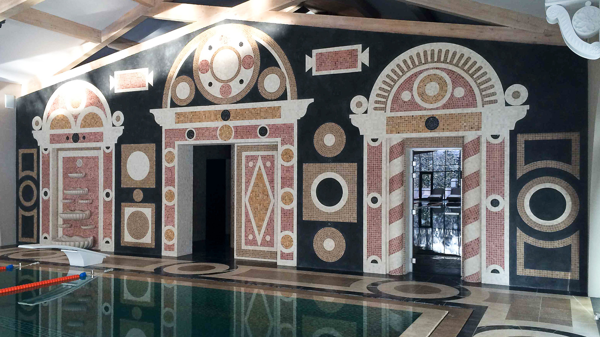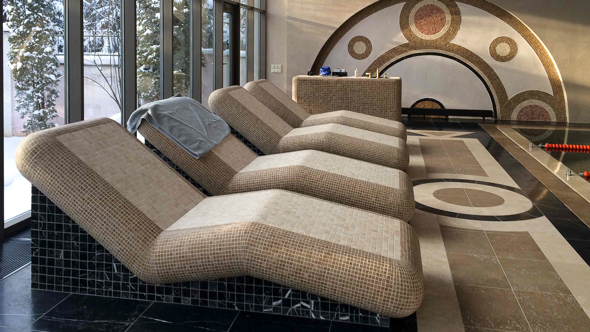 Работа, выполненная по смешиванию различных цветов мозаики для внутренней части бассейна, также была интересной: дизайнеры хотели, чтобы глубина вода увеличилась, цвет мозаики стал темнее. Поэтому, выбрав 4 тона травертина , их процентное содержание варьировалось в зависимости от глубины.