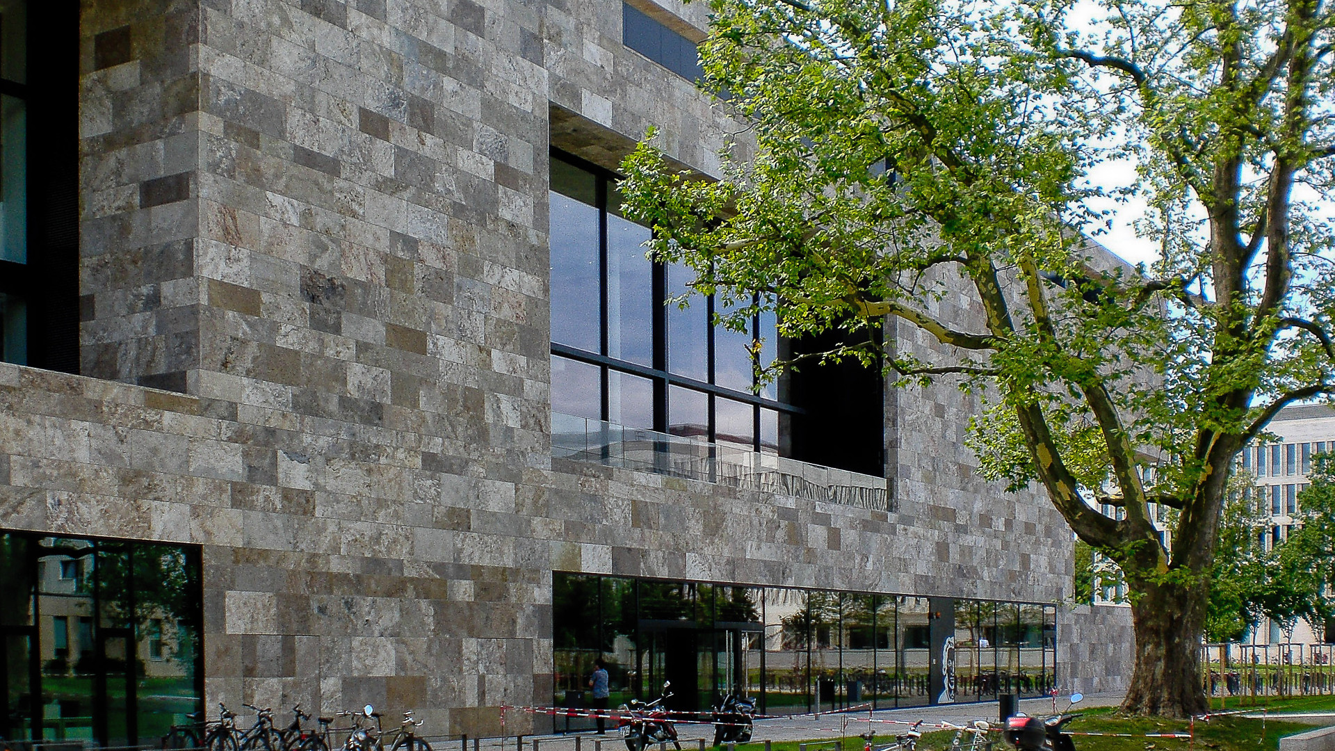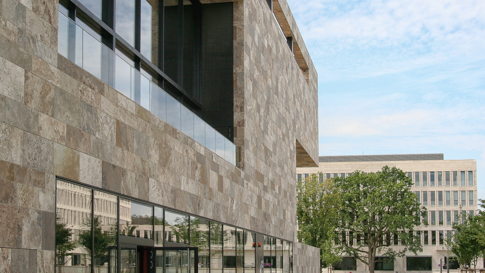 целая стена из травертина украшает фасад нового здания Кампуса Университета Дж. У. Гете во Франкфурте , также используется как университетская столовая.